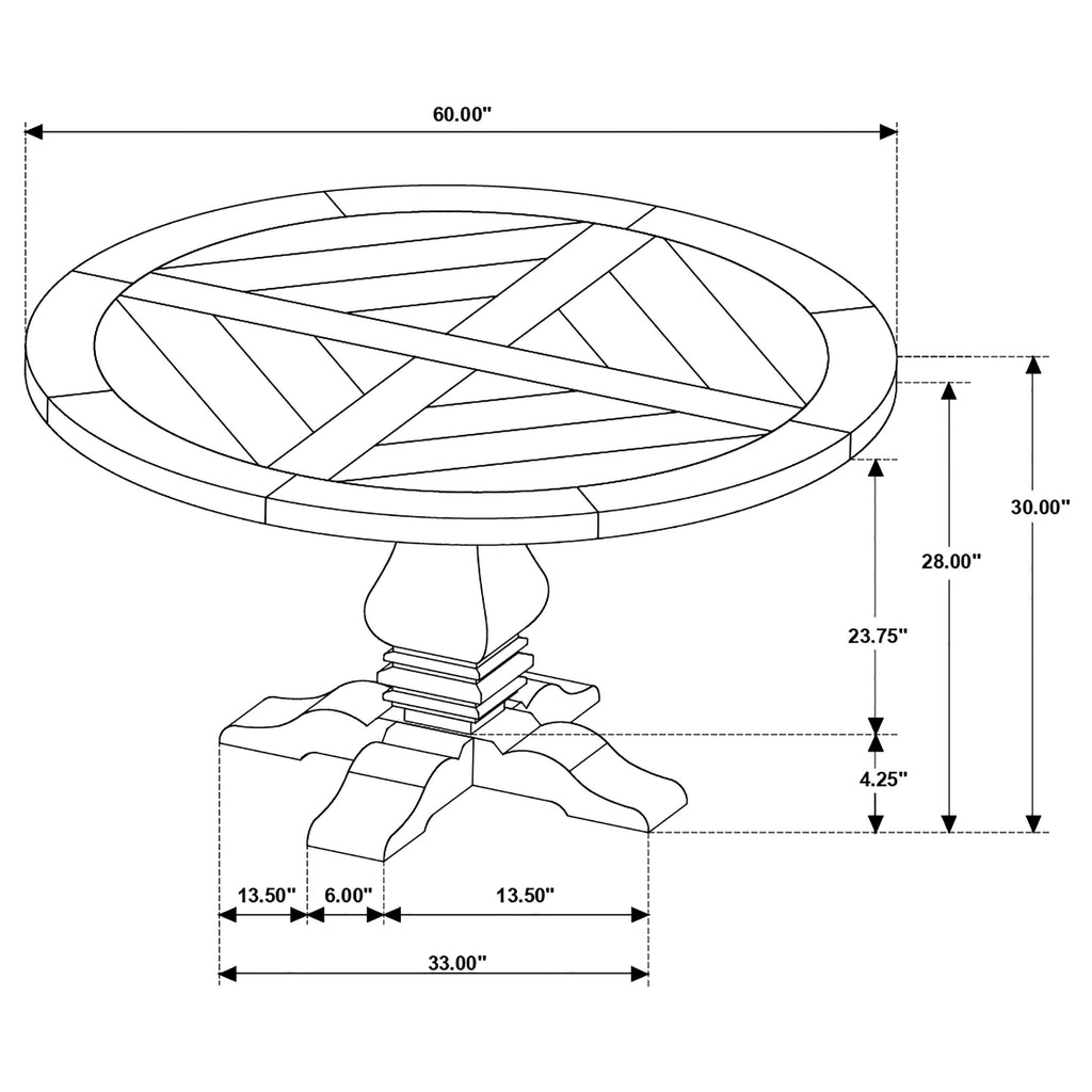Inspired by 18th and 19th-century European design, this French country-style dining table blends timeless elegance with rustic charm. Crafted from solid pine, it features a round top with an intricate inlaid veneer pattern that enhances its refined character. The bold pedestal base, with sculpted detailing and curved feet, evokes the craftsmanship of traditional farmhouse and Colonial-era furniture. A weathered finish completes the look, making this table a warm and inviting centerpiece for any dining space.