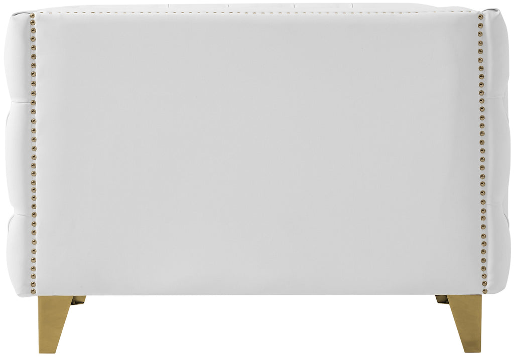 Upholstered in soft white faux leather, this Michelle chair is sumptuously glamorous. Designed for upscale living, this chair features rich gold nail head trim and gold iron legs that keep it grounded in contemporary beauty. Tufted material covers every inch of this unit, and button tufting ensures that the unit stays plump and comfortable and holds up well to continual use. Pair it with other items in the collection for a cohesive look.