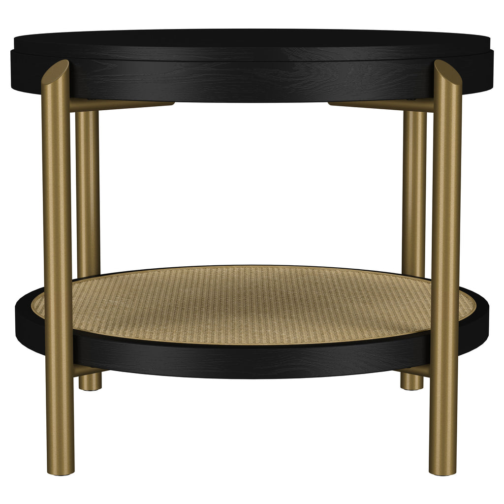 This round end table showcases a refined blend of natural and industrial elements, perfect for modern interiors. Crafted from Asian hardwood, engineered wood, and ash veneer, its finish highlights the table's organic grain for a subtle, rustic appeal. The lower shelf features natural woven rattan, offering functional storage with a stylish touch. Sturdy aged brass-finished metal legs provide contrast and durability. Ideal as a side table or accent piece, it combines elegance and utility effortlessly.