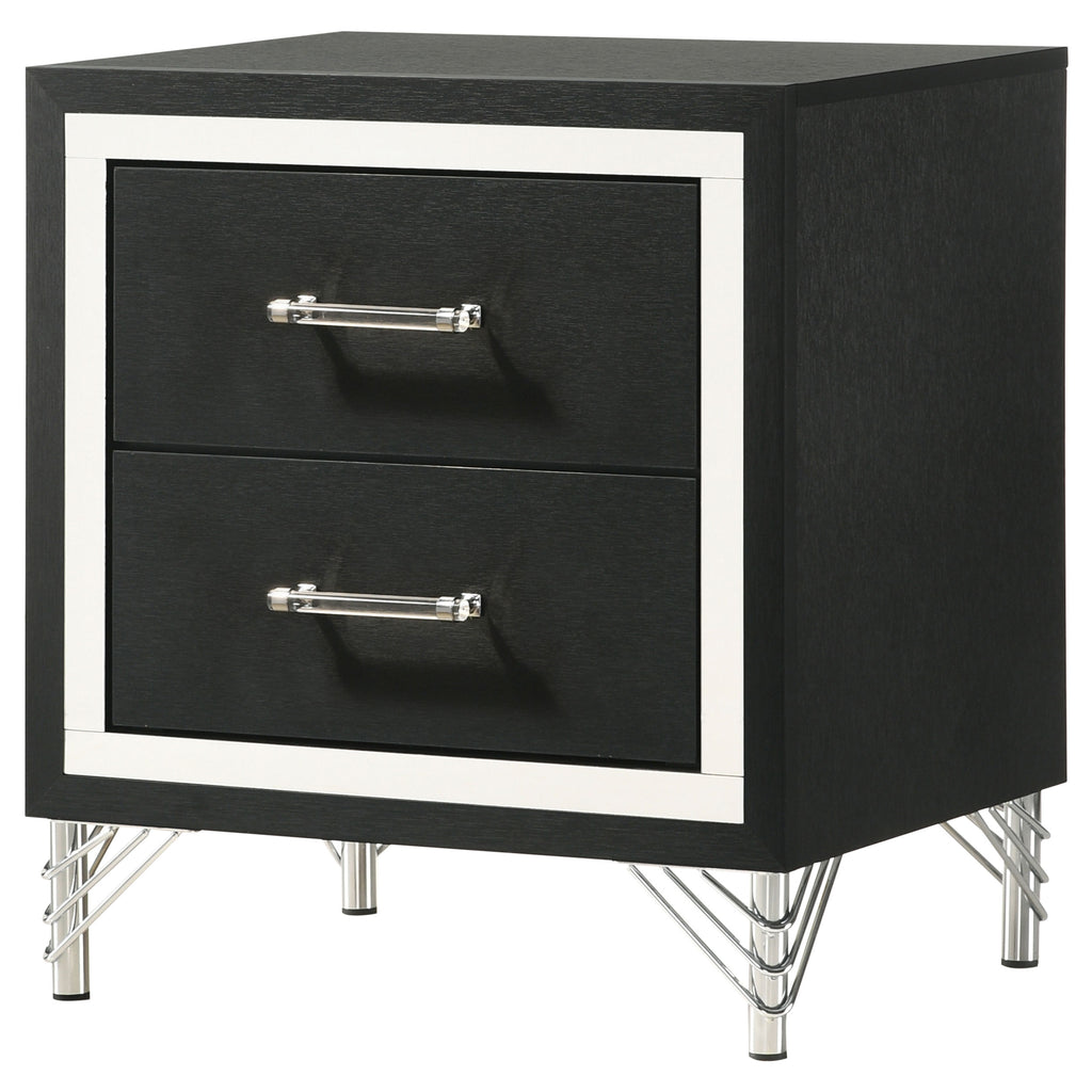 Gleaming gold trim captures attention on a modern two-drawer nightstand. Perfect for your sophisticated bedside, it boasts a bright white finish case that offers the perfect touch of depth with its gold trim. A pair of long bar pulls decorate drawer fronts. Hairpin style legs offer vintage flair and exceptional elegance. Two drawers add plentiful bedside storage, offering a place to ruck away personal items and overnight essentials.