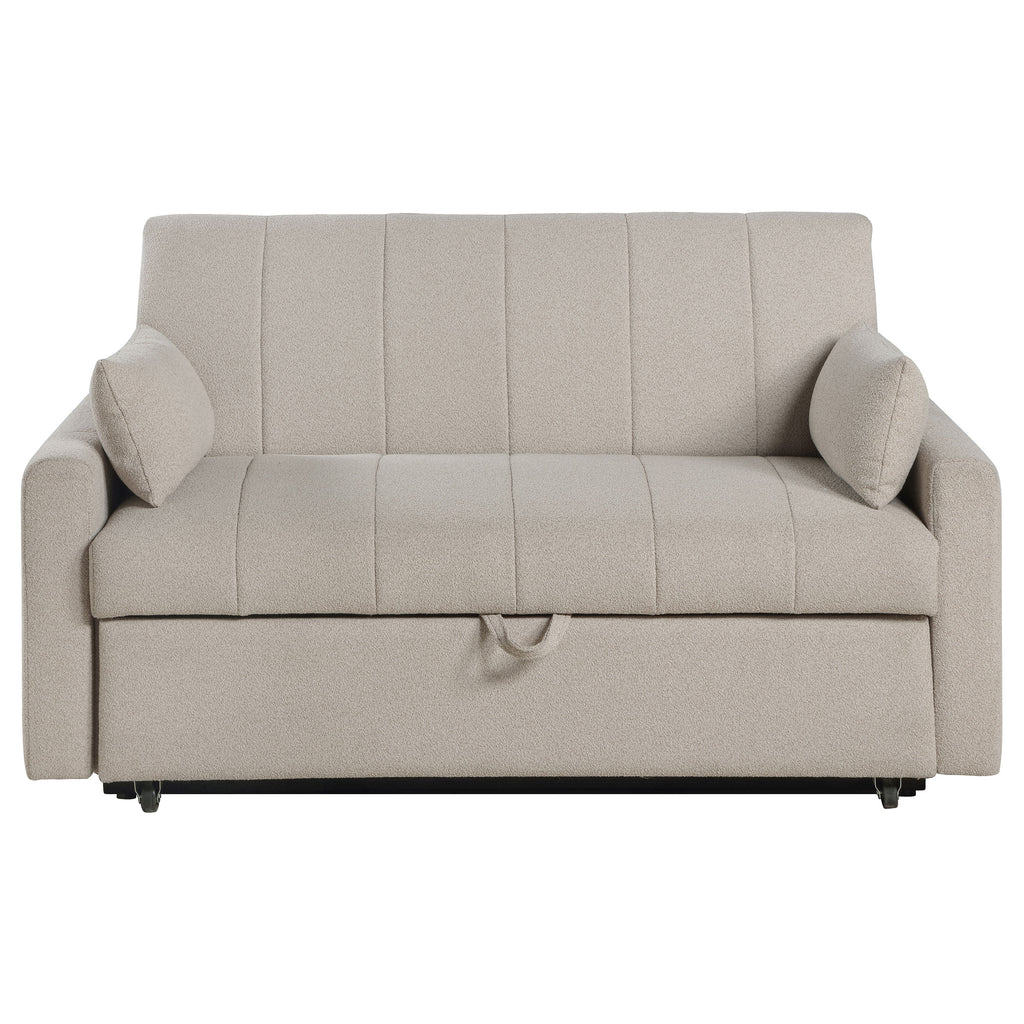 This modern sleeper sofa combines both style and function, featuring luxurious boucle fabric upholstery for a textured, inviting feel. Perfect for small spaces or multi-purpose rooms, the sofa showcases clean lines and vertical channel tufting, adding a contemporary touch to your home. Effortlessly transform it into a bed with a smooth pull-out mechanism, offering a comfortable sleeping area for overnight guests. The plush foam-filled cushions ensure maximum comfort, while built-in casters on the sleeper section make setup easy. With its versatile design and cozy boucle fabric, this sofa is a seamless addition to any living room or guest bedroom. Key Features: • Modern sleeper sofa upholstered in luxurious latte colored boucle fabric for a cozy, textured look • Vertical channel tufting adds a contemporary flair • Easy pull-out mechanism converts the sofa into a bed with built-in casters for smooth operation • Plush foam-filled cushions provide exceptional comfort for both seating and sleeping • Includes matching bolster pillows for added style and support