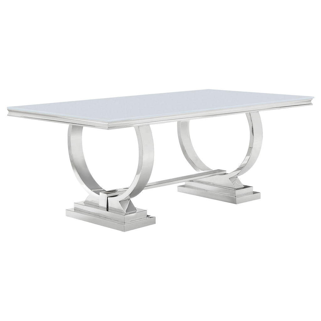 Elevate your dining experience with our 5-piece dining set. The elegant dining table features an expansive opaque white tempered glass surface. Its stainless steel trestle base, adorned with gleaming chrome-finish ring-shaped end supports, adds a sophisticated touch. Complementing the table's opulence, our upholstered side chairs boast soft velvet upholstery and polished chrome legs, blending luxury with comfort. Crafted from stainless steel, these chairs promise durability and opulence. The set includes four expertly cushioned dining chairs in refined hues, adding curves and excellence. Transform your space into a haven of sophistication, where every meal becomes a lavish experience.