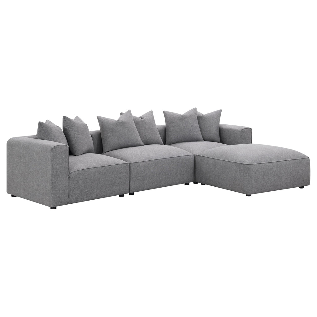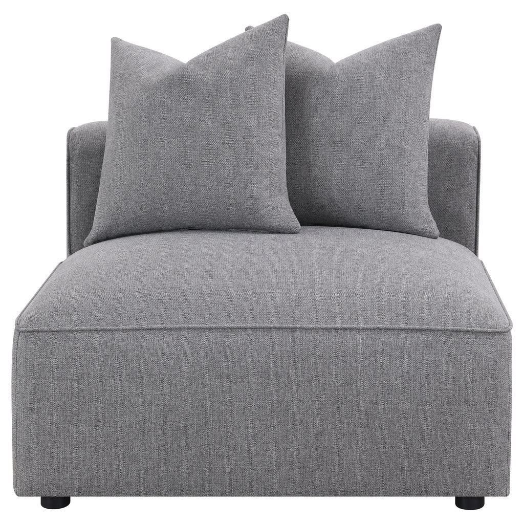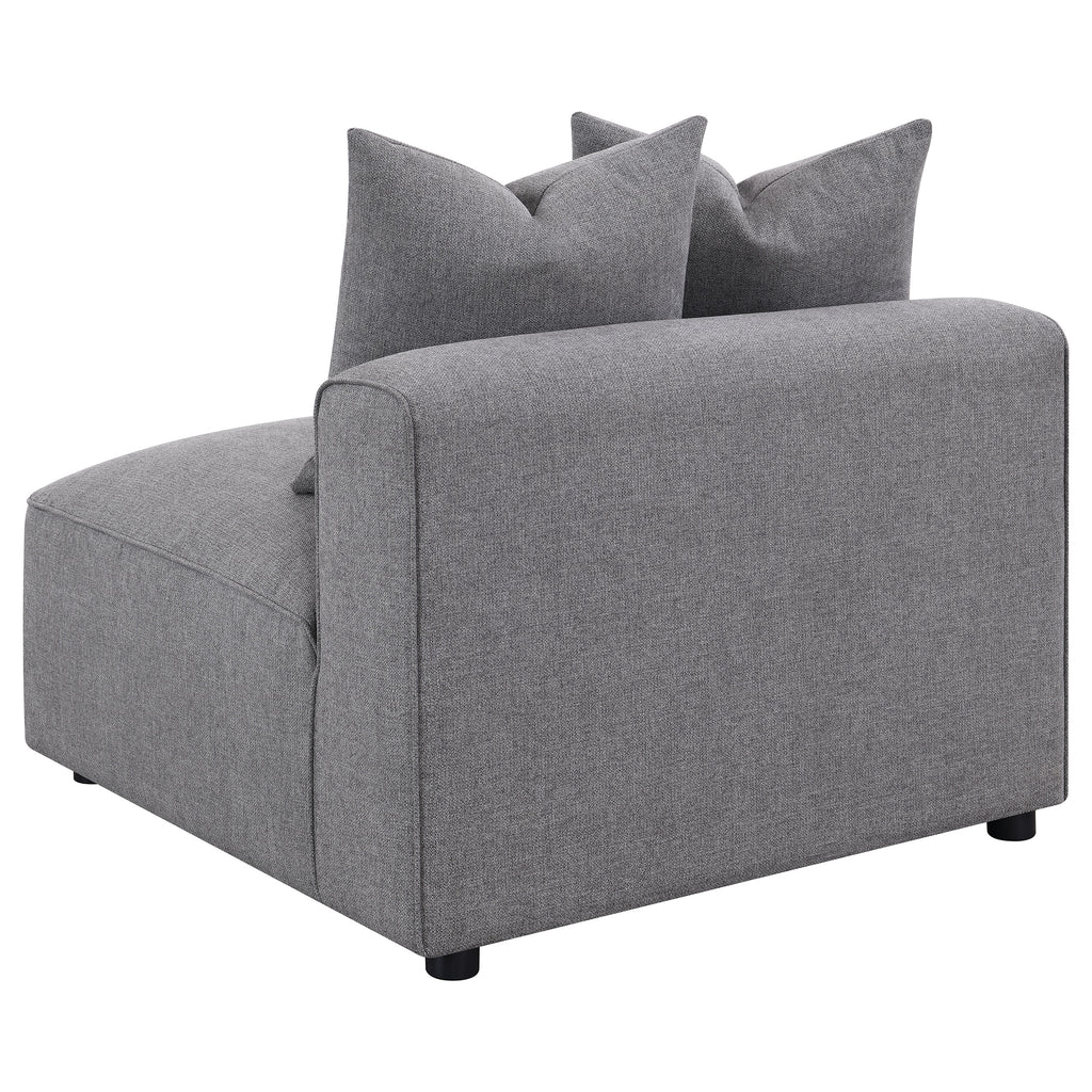 Elevate your modern seating area with this contemporary modular armless chair, upholstered in a soft terracotta trillium polyester blend fabric across its tailored tight back, thick cushion and matching throw pillows. Self-welt trim along the seat edge and backrests offer an elegant finishing touch, along with non-skid grip protectors on the legs. Complete your modular sectional configuration with this additional modular chair.