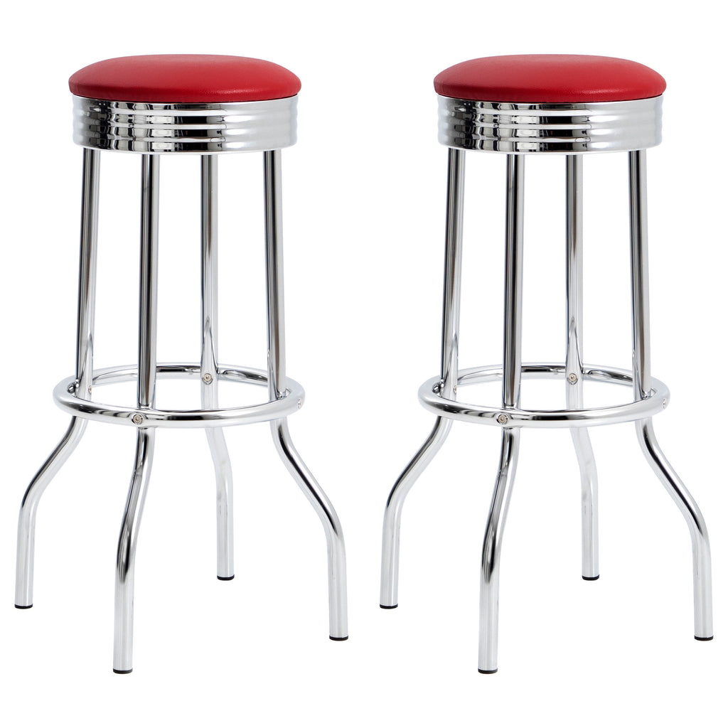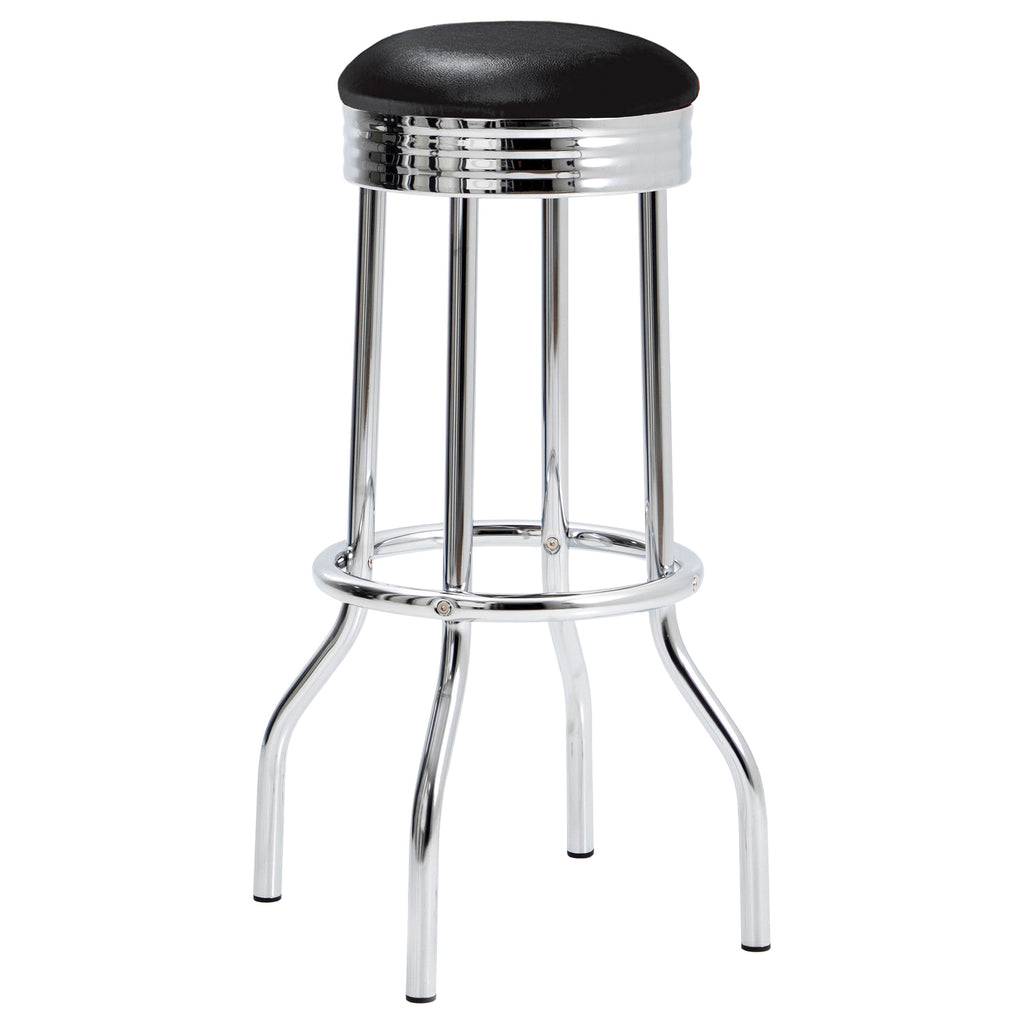 Bring nostalgic charm to your home with this retro swivel bar stool, blending diner-inspired design with modern comfort. A round padded seat in white leatherette pairs effortlessly with a ribbed chrome apron for vintage appeal. The electroplated chrome base provides stability with flared legs and a supportive footrest. Crafted from heavy gauge metal and cushioned with foam, it offers smooth 360-degree swivel functionality perfect for everyday use. Key Features: • Retro-style swivel bar stool adds vintage appeal to casual dining spaces • Electroplated chrome base features ribbed apron for iconic mid-century flair • Smooth 360-degree swivel function provides flexible seating and easy movement • Padded round seat upholstered in soft, easy-to-clean white leatherette • Durable construction with heavy-gauge metal and supportive foam cushioning • Circular footrest and flared legs offer added stability and timeless style
