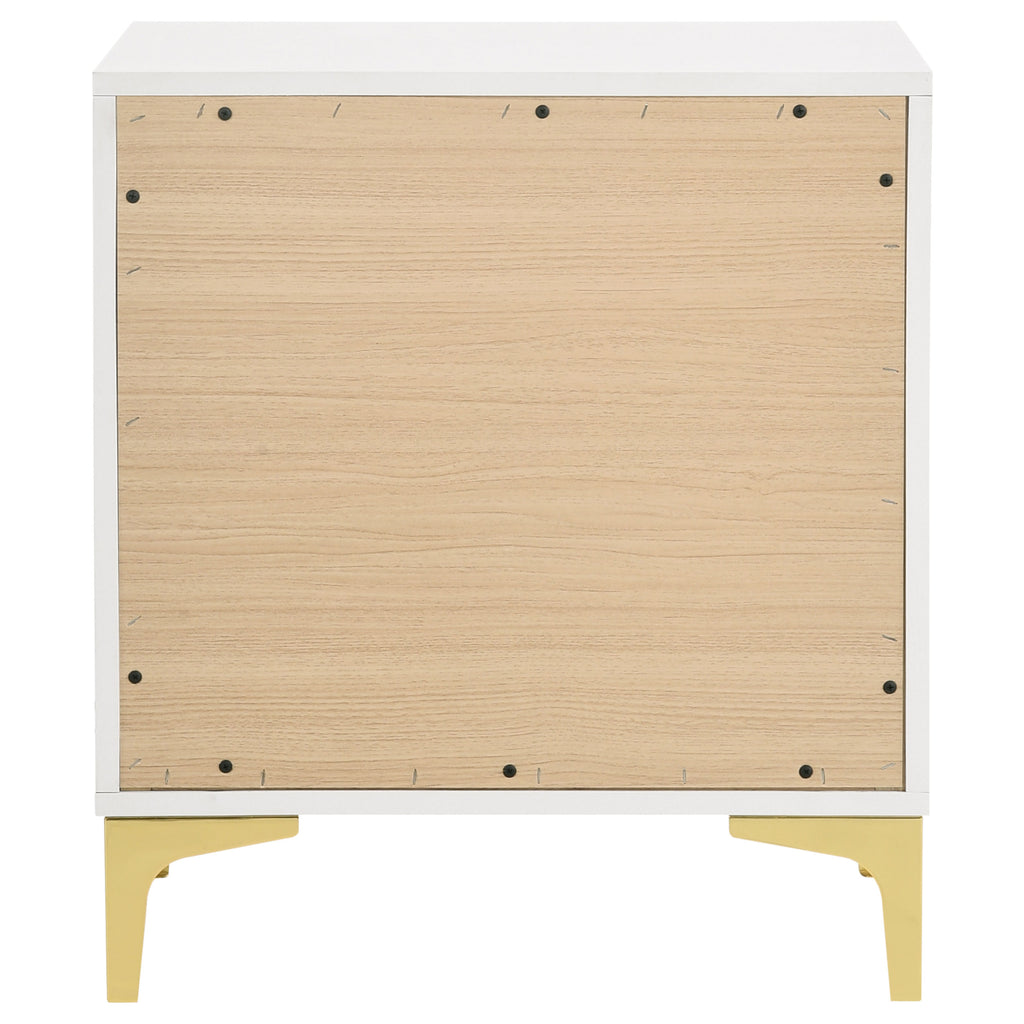 Flank your bedside with this modern glam nightstand. Designed with an elegantly understated, boxy frame, this two-drawer nightstand lends a chic, contemporary aesthetic. Clean lines and a bright, white finish elevate its sophisticated nature. Fastened to each deep drawer is a slim gold pull handle for a touch of metal. Unifying the warm metallic elements are gold bracket style legs that lend a retro look and feel. Key Features: • Perfect for contemporary and modern bedrooms • Two deep drawers offer all the space you need for bedside essentials • The bright, white finished frame ensures a light and airy disposition • Gold finished pull handles create a luxe flair • Gold bracket style legs carry through the warm metallic accents