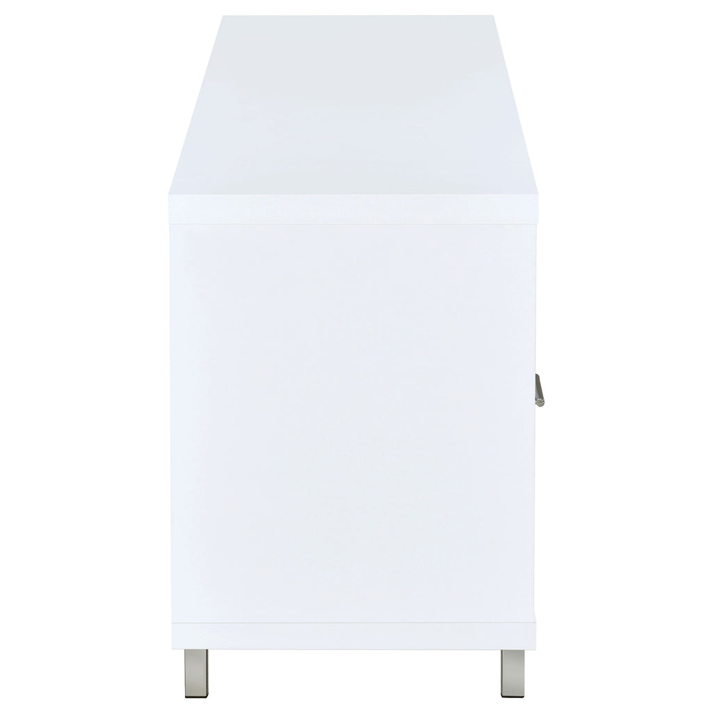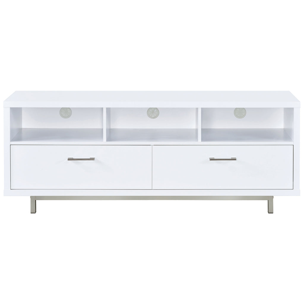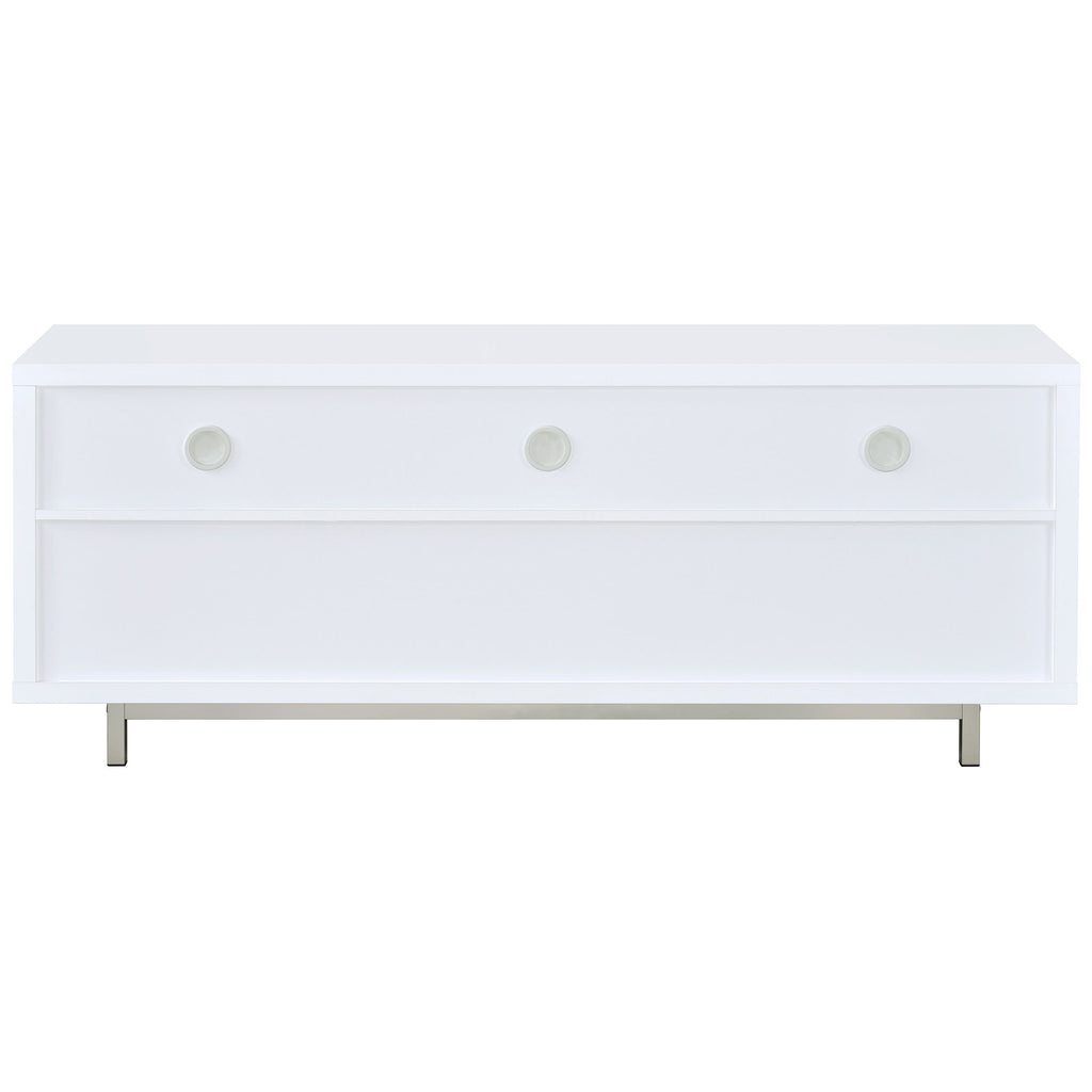 Ideal for a living room with contemporary decor, this TV console exudes updated style. The dazzling shine of chrome combines with a crisp, clean white finish for a pleasingly modern look. Its chic silhouette is complete with an elegant brushed silver frame, adding a pleasing touch of polish. Endlessly versatile, it features three open storage compartments and two large lower drawers to easily keep your space organized. For added depth and a more subdued look, this console is also available in deep, rich cappuccino. Key Features: • TV console finished in white with metal base finished in chrome • Constructed with MDF, particle board, laminate, and steel • Features three (3) storage compartments and two (2) storage drawers • Available in white and cappuccino • Euro drawer glides