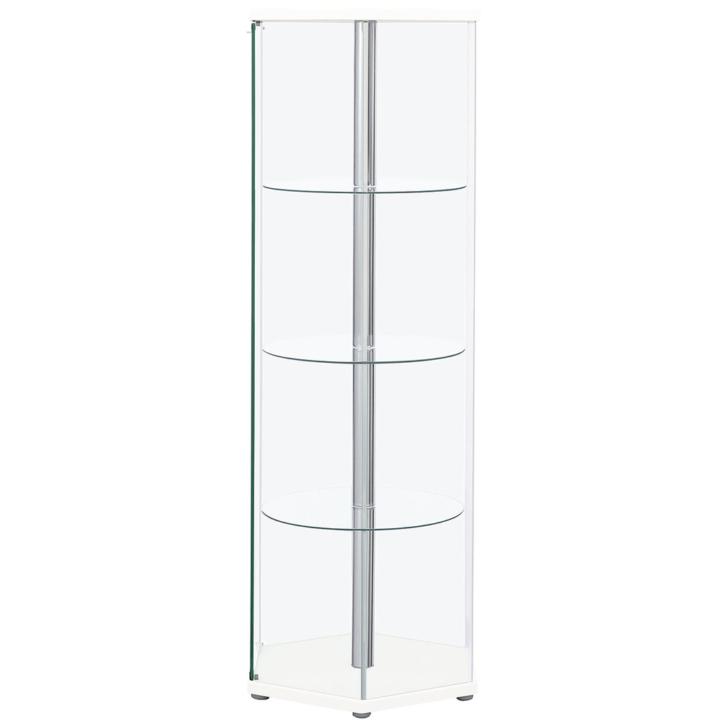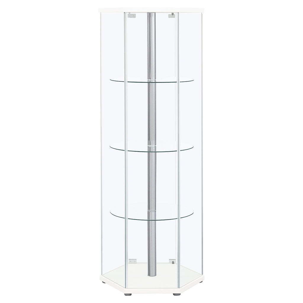 This curio cabinet reimagines display storage with a striking hexagonal silhouette. Its geometric shape adds visual depth while clear tempered glass panels showcase treasured items from all angles. Three round glass shelves offer generous space for décor, collectibles, or keepsakes, supported by a sleek center pole with chrome accents. With a magnetic push-to-open door and sturdy construction of glass, engineered wood, and laminate veneer, this piece is a stylish way to highlight what matters most. Key Features: • Hexagonal curio cabinet in black with sleek chrome accents and center pole • Magnetic push-to-open clear tempered glass door provides easy access • Three round tempered glass shelves for collectibles and decorative items • Clear tempered glass panels highlight displays from multiple viewpoints • Constructed with glass, engineered wood, laminate veneer, and metal • Geometric design creates a striking modern presentation for display pieces