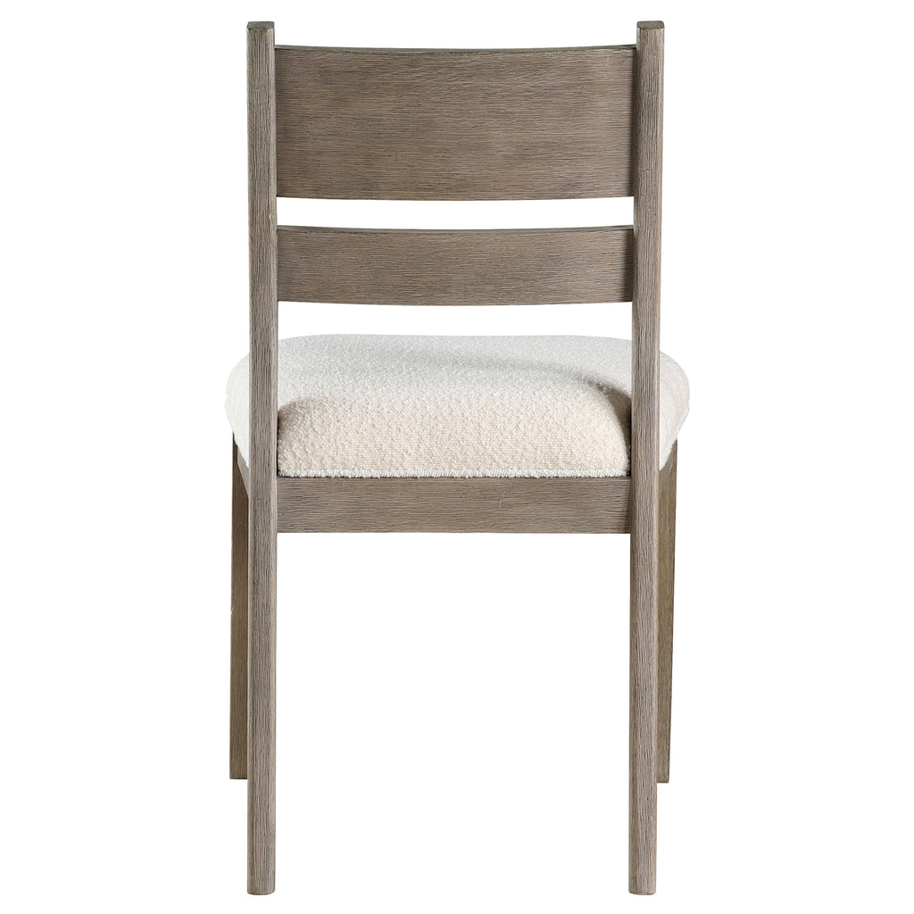 Upgrade your dining table with a set of two modern farmhouse side chairs. Perfect for a casual kitchen table, they feature coastal character with a grey wood finish that offers subtle wood grain patterning. Upholstery is a creamy white with wonderful texture that adds depth and comfort. The inviting chair design includes a gently angled back with a modified ladder back that pairs a wide top slat with a slimmer lower slat to create a compelling asymmetric silhouette. This pair is great for kitchens and dining rooms, alike. Key Features: • Approachable modern farmhouse style infuses a charming wood side chair for your dining table • Features rubberwoods and plywood to create stability and style • Coastal grey wood grain finish is light and on-trend, perfect for casual family dining spaces • Features textured cream upholstery over padded foam for a comfortable, cushioned seat • Modified ladderback design creates a sense of texture and dimension while maintaining casual appeal
