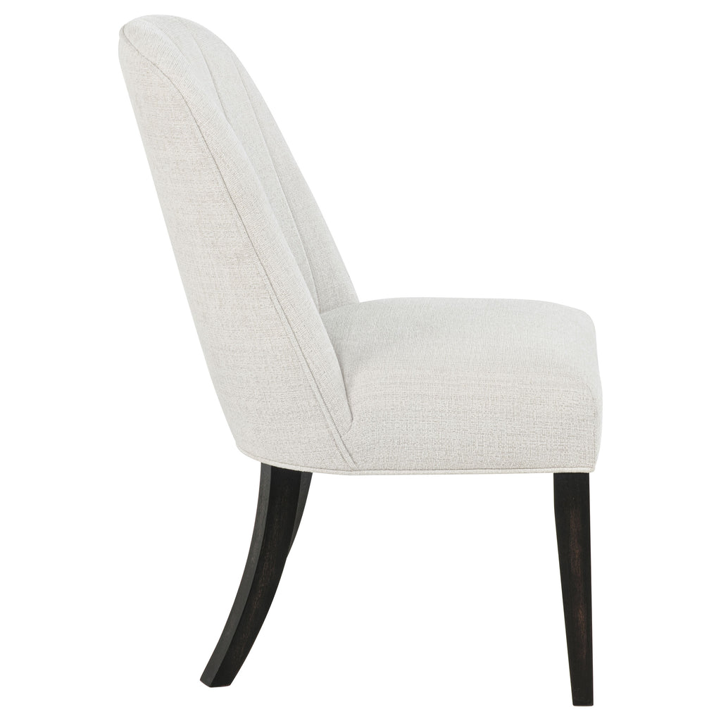 Graceful by design and soothing in tone, this upholstered dining chair invites lingering with every curve. Draped in creamy fabric, its gently channeled backrest rises in soft vertical lines, embracing you in subtle elegance. Burnished black legs flare with sculptural ease, grounding the silhouette in warm contrast. From candlelit dinners to quiet morning coffees, this chair offers a seat not just at the table, but at the heart of the home. Key Features: • Dining side chair wrapped in cream fabric with subtle channel tufting along the back • High back design offers supportive comfort for long meals and conversation • Burnished black flared legs contrast beautifully against the light upholstery • Foam-padded seat and backrest provide soft, resilient cushioning • Crafted from rubberwood, engineered wood, and performance fabric • Perfectly pairs with round or rectangular tables for modern, timeless appeal