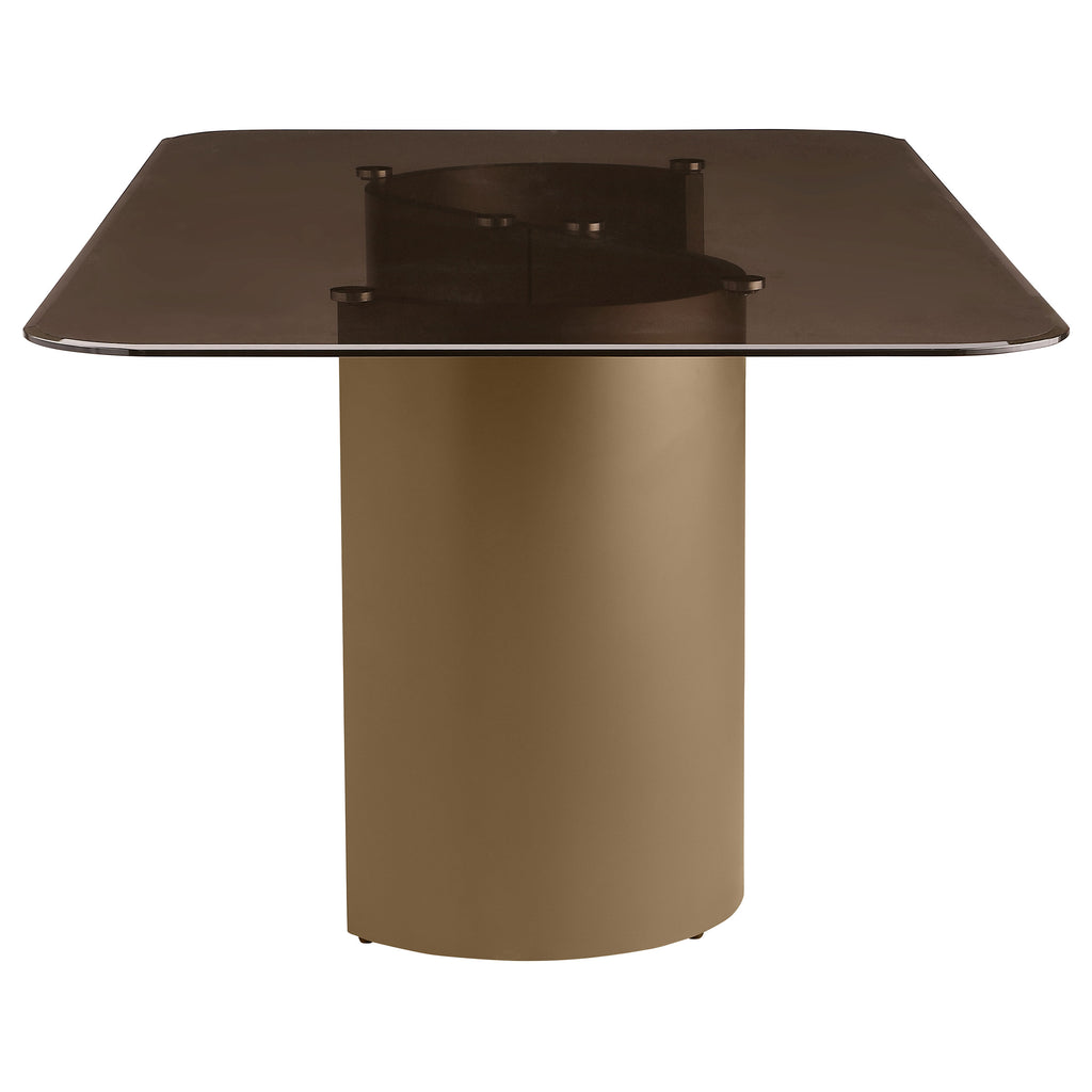 Sinuous curves bring unified style and sophistication to the table and chairs in this five-piece modern dining set. It delivers a stylish rectangular table complete with a sculpted base in a warm, rich bronze finish. The tabletop is black finish glass, adding cool, glossy elegance. Chairs feature U-shaped backrests and plush seats, both with foam padding and textured black boucle upholstery. Tapering legs in a matching bronze finish complete the chairs and create a sense of cohesion for the set.