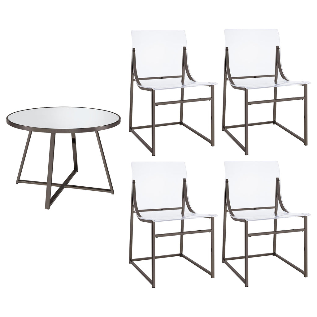 Elevate your dining experience with this striking five-piece dining set, blending contemporary design with modern elegance. The centerpiece is a round dining table, featuring a sleek mirror glass tabletop and supported by angular, open frame legs that add a touch of geometric flair. Complementing the table are four avant-garde dining chairs that redefine modern style with their clear acrylic backs and minimalist metal frames. The black nickel finish of the table and chairs enhances the set's sophisticated appeal, making it perfect for both casual meals and elegant entertaining. Whether hosting dinner parties or enjoying a quiet meal, this dining set transforms your space into a chic dining oasis. Key Features: • Five-piece dining set includes a round table and four chairs • Mirror glass tabletop with angular, open frame supports for modern flair • Dining chairs feature clear acrylic backs and minimalist metal frames • Black nickel finish adds contemporary elegance to any dining space • Perfect for both casual dining and stylish entertaining