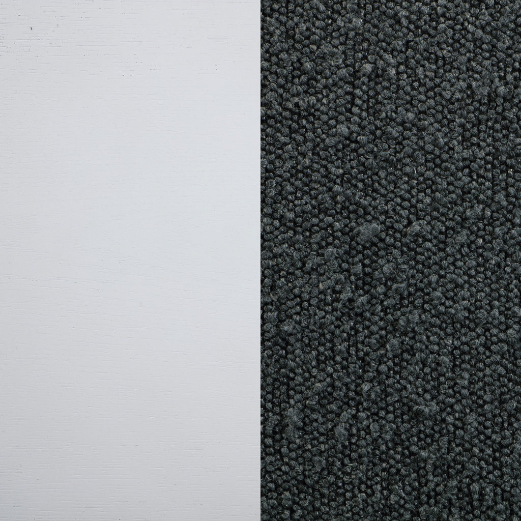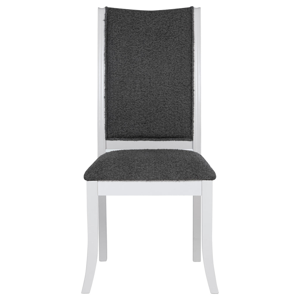 Embrace a modern minimalist presentation with this contemporary dining set. It centers on a roomy round dining table that seats four to six, with flared legs and a round shelf that adds stability and decorative potential. The set adds side chairs, each with a tall, structured silhouette and dark gray upholstery over plush foam cushions. A pearl white finish is clean and fresh, offering plenty of contrast against the gray. The set instills a clean, precise aesthetic, perfect for minimalist or maximalist decor themes.
