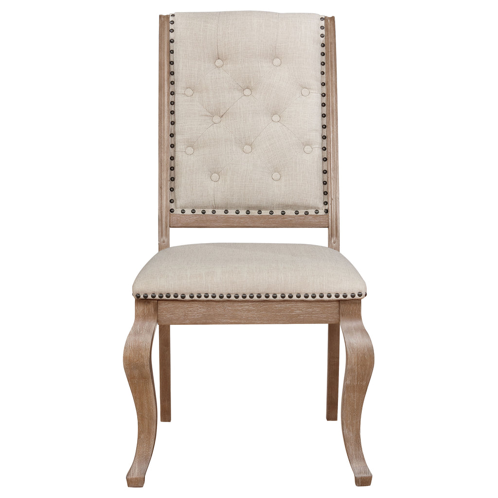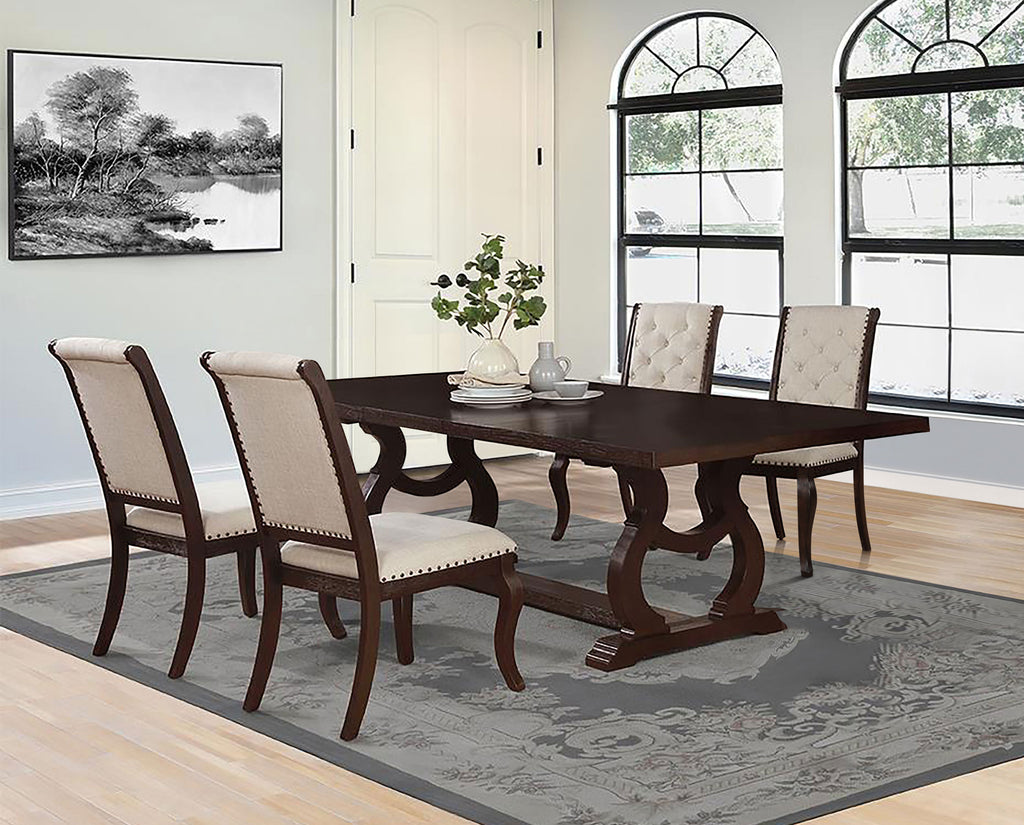Terrifically transitional with subtle glam details comes this wood and upholstered dining set. Including a 20” removable extension leaf, this beautiful wood dining table is finished in a natural wood color with distressed wood grain accents. The dual pedestal base offers a final touch of traditional appeal. Find gorgeous coordinating dining chairs, upholstered in cream fabric. The dining chairs are adorned with individually applied nailhead trim with cabriole style legs for a finishing touch.