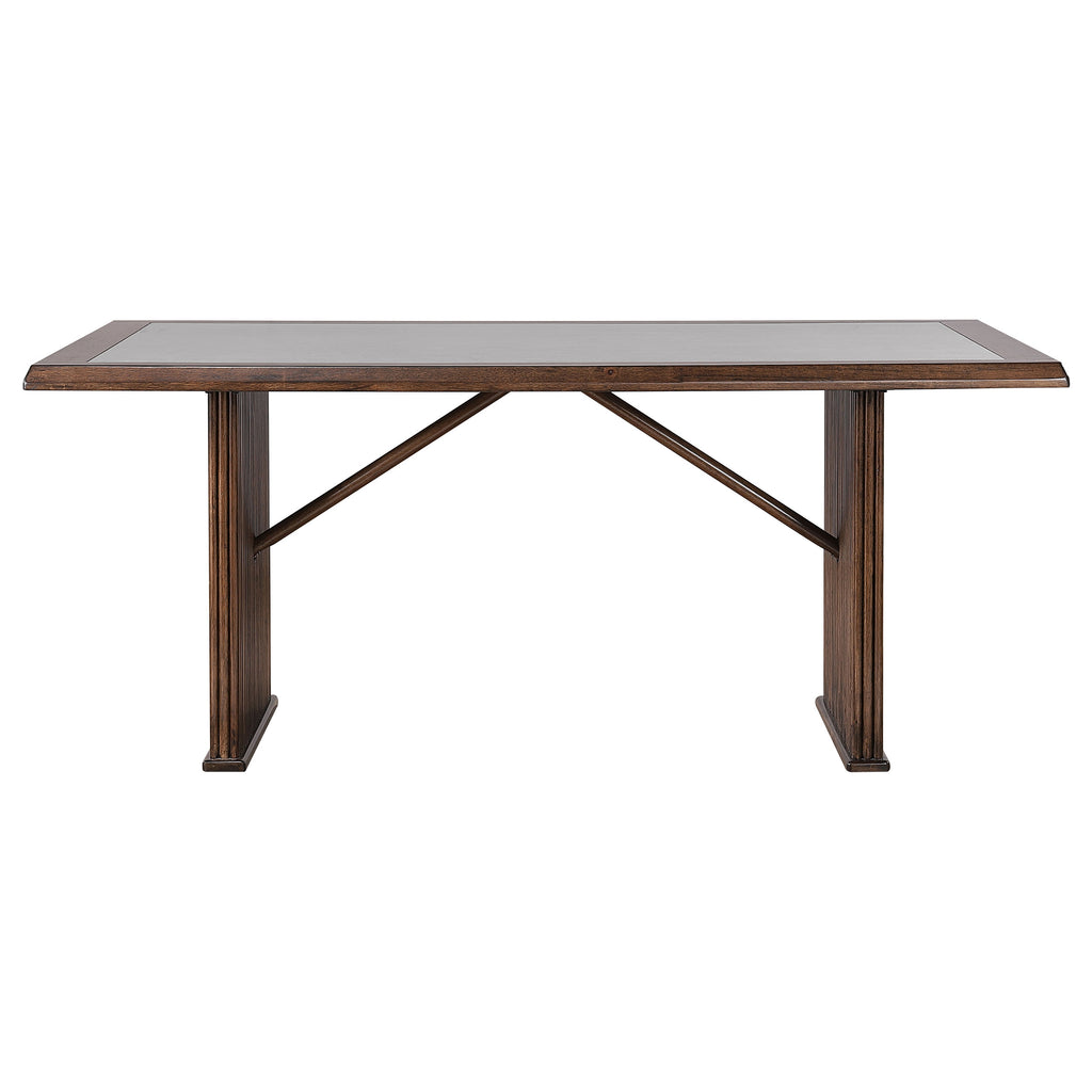 Transform your dining area with this sophisticated dining set, featuring a 72-inch reeded dining table and complementing upholstered side chairs. The table's ceramic top combines elegance and durability, while the reeded base adds texture and timeless appeal. Paired with side chairs upholstered in soft gray fabric, this set ensures both style and comfort. The sturdy Asian hardwood construction guarantees long-lasting use, making it perfect for family meals or dinner parties. A harmonious blend of form and function, this set elevates any dining space.