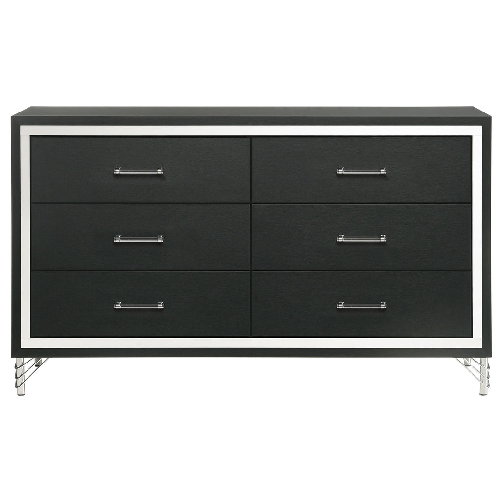 Accentuate surrounding decor with the sophistication of a modern six-drawer dresser. Designed for ample storage, it features a refined look with spacious drawers ideal for everything from clothing to accessories and linens. Its bright white finish is crisp and chic, complemented perfectly with rich, warm gold trim that gleams in the light. Decorative legs have hairpin inspired style, offering a stylish touch of vintage energy. Long bar pulls complete the look with polished perfection.
