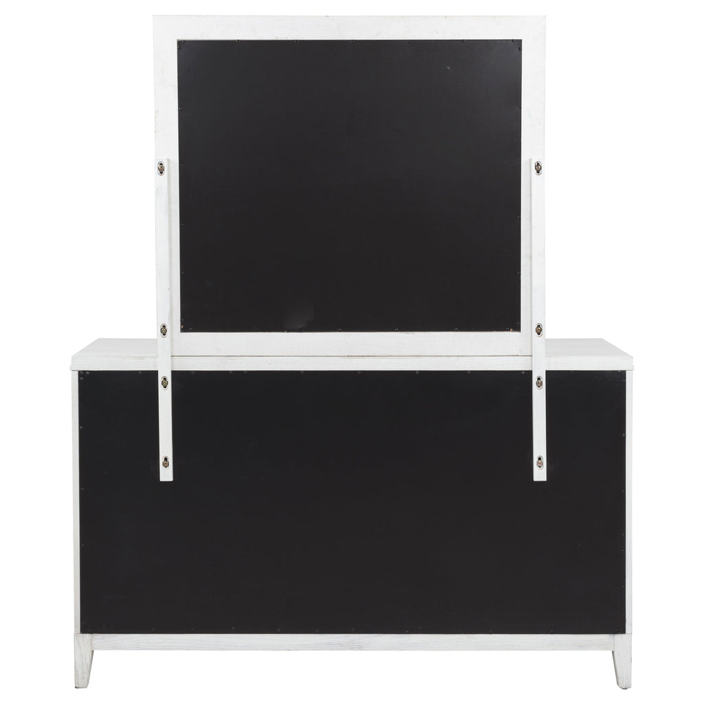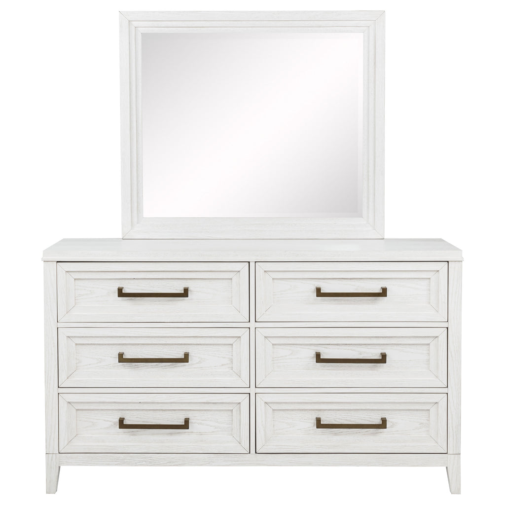 Introduce fresh style and inviting texture with a modern six-drawer dresser and framed mirror. It shows off a distressed white finish over wood grain texture, offering an inviting look and feel in your living room. Each drawer front features layered trim that creates depth and is augmented with a long bar pull in antique brass finish to create contrast. The mirror on top features a squares silhouette with layered trim that matches drawer fronts. Tapered legs complete the look and a tip over restraint is included to add safety in your bedroom. Key Features: • A modern six-drawer dresser with a framed mirror offers a clean-lined silhouette and lots of storage • Distressed white finish highlights wood grain details and bar hardware to create texture and depth • Dresser includes six drawers of equal size, perfect for clothing, accessories and even linens • Tip over restraints are included to add safety and peace of mind to this stylish set
