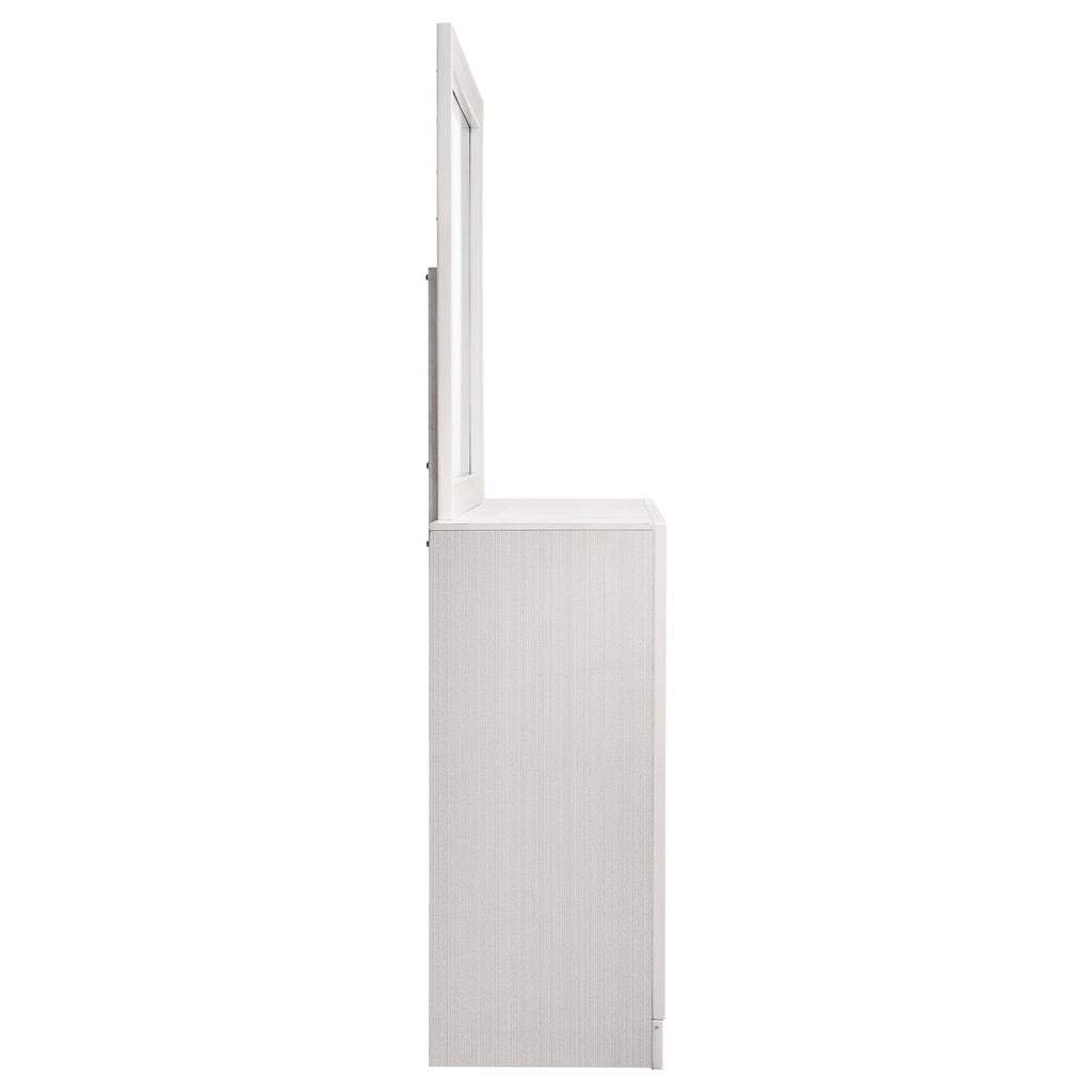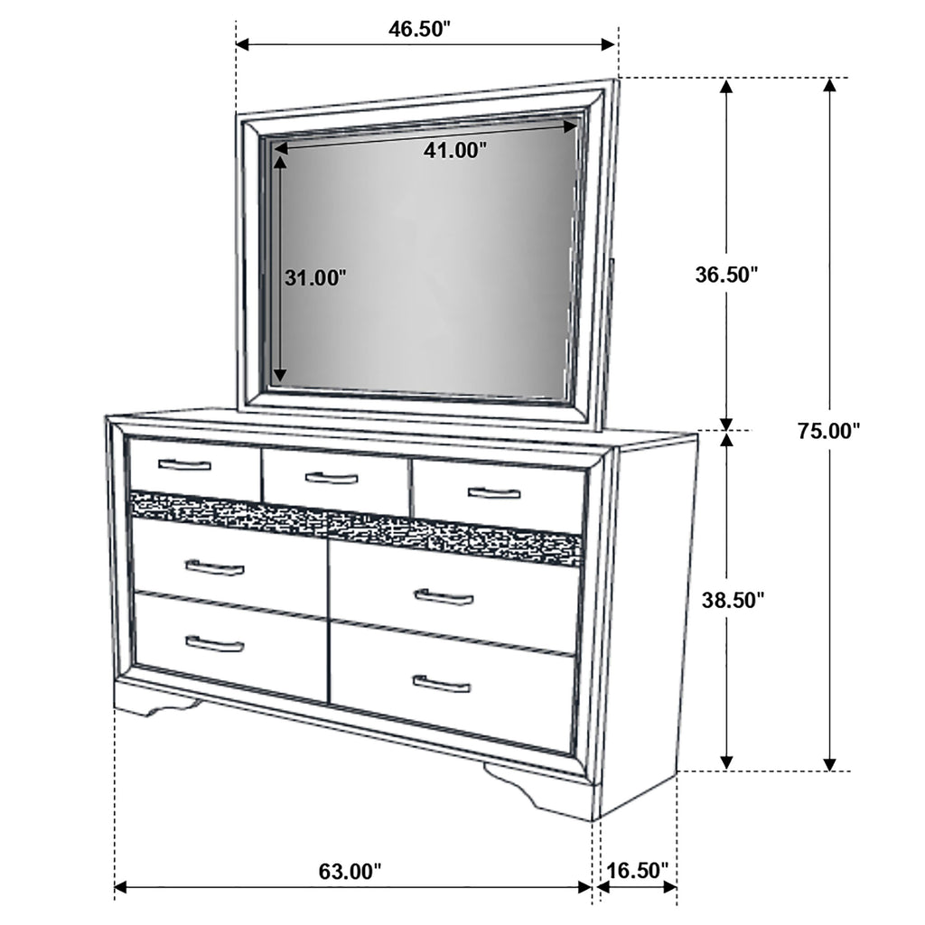 Bring sophisticated grace to your bedroom with this chic dresser, designed to lend an elegant touch to your personal sanctuary. Its felt-lined drawers offer safekeeping for delicate belongings, while the hidden jewelry drawer provides a discreet space for your treasures. The glittery panel across the front sparkles with opulence, enhancing the dresser's allure. Complementing the piece is the cheerful mirror, whose linear design and framed construction add a stylish ambiance. Choose from various finishes to perfectly round out your bedroom's design scheme. Key Features: • Seven-drawer dresser with smooth full-extension glides • Hidden jewelry drawer set behind glitter accent panel • Top drawers are felt-lined for delicate storage • Crystal drawer pulls add sparkle and contrast • Framed mirror with beveled edges complements the dresser • Constructed from engineered wood with white finish