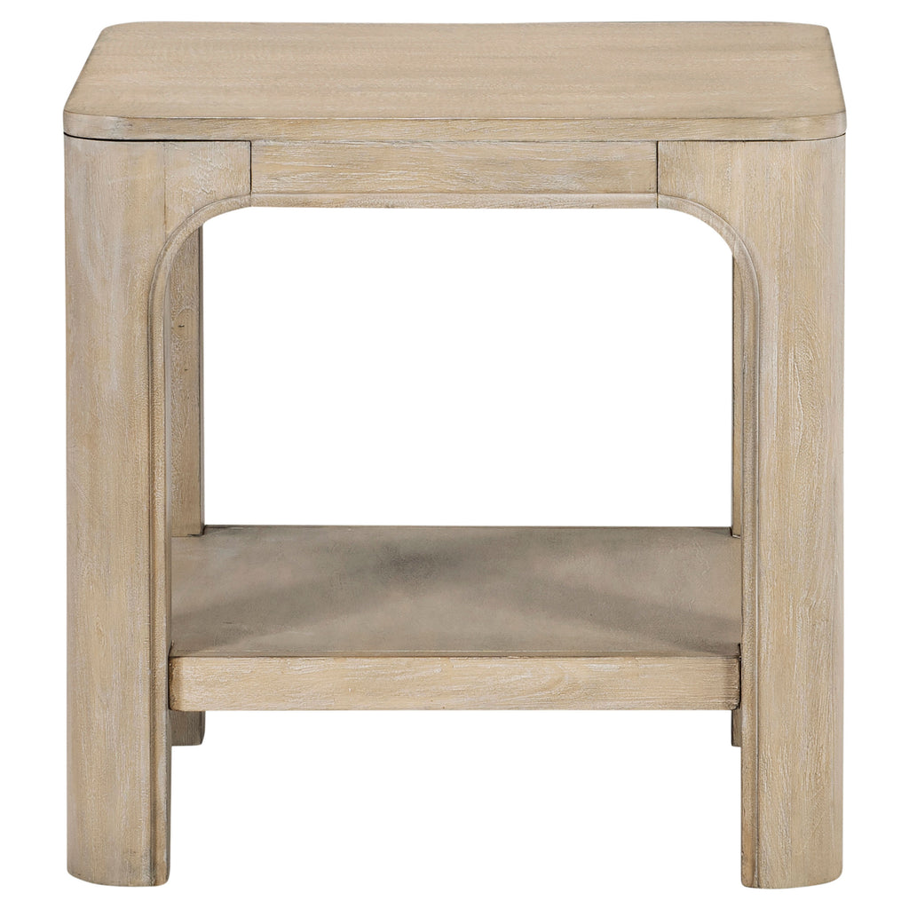 With its softened edges and grounded silhouette, this end table evokes casual refinement. A square top floats above subtly arched legs for sculptural appeal. Made from solid mahogany, engineered wood, and mango veneer, it offers lasting strength and natural texture. A lower shelf adds convenient storage, making this accent table as functional as it is timeless. Use it as a side table or occasional table in your living room or lounge. Key Features: • Square end table with shelf and sculpted legs for an elegant living room accent • Weathered mango finish reveals subtle grain and neutral organic texture • Lower open shelf adds extra storage space for everyday essentials or décor • Gently curved corners and rounded legs lend a soft, architectural silhouette • Crafted from mahogany, engineered wood, and mango veneer for lasting quality • Perfect as a side table or occasional table in casual or transitional spaces