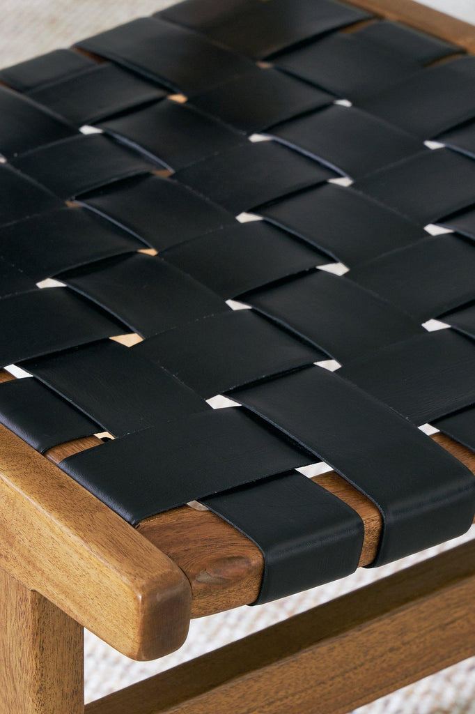 This dining chair takes minimalism to the max. Crafted with a sleek and sophisticated touch, its seat and back are made of woven leather straps skillfully attached with bronze-tone nailheads. Your search for simple, contemporary design ends here.