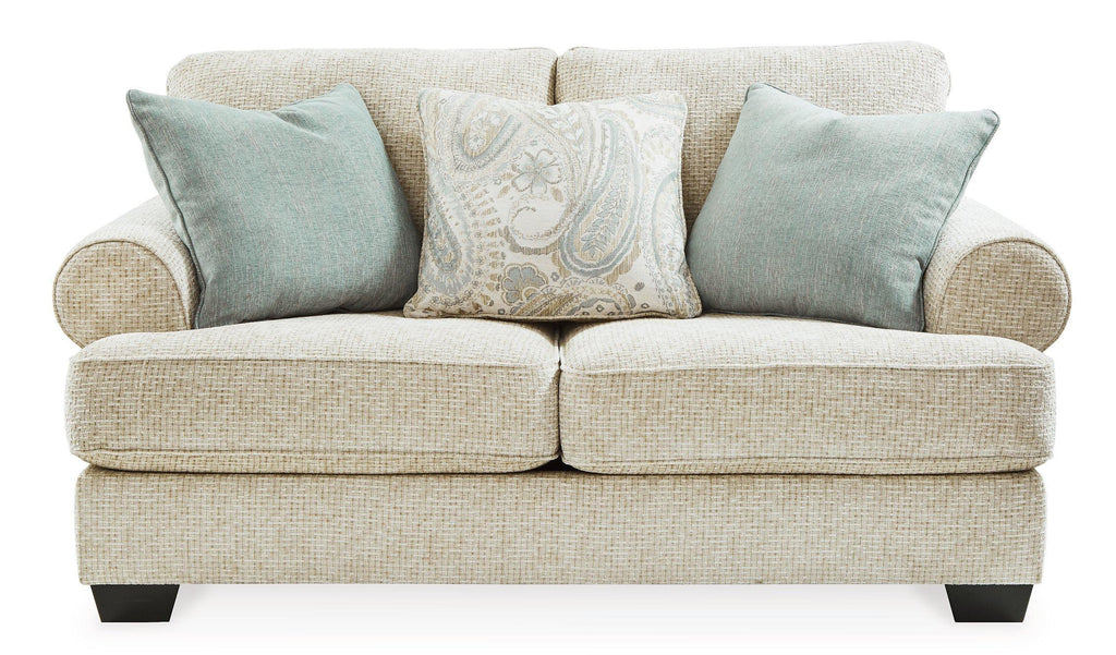 This loveseat strikes a beautiful balance between classic and current. Traditional elements include t-cushion seating and setback roll arms, angled for modern flair. Posh collection of pillows in spa mist and jacquard paisley make a muted, mellow complement to the loveseat’s casual textured chenille upholstery. Choice of sandstone beige is a light and lovely style awakening.