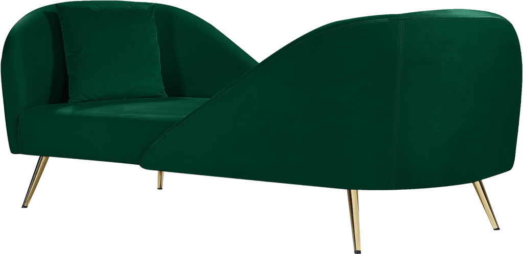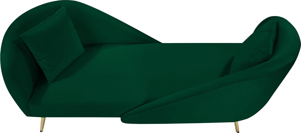 Bring glamour and old world Hollywood appeal to your space with this Nolan velvet chaise. This chaise is outfitted with soft green velvet to give it added glitz and elegance. It rests atop gold metal legs for a touch of contemporary pizzazz, and it has two backs for a throwback feel that���s nothing short of sophisticated. Use it wherever you want to up the excitement level in your room.