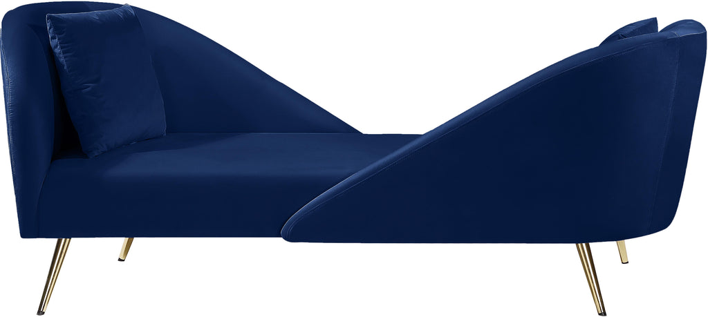 Bring glamour and old world Hollywood appeal to your space with this Nolan velvet chaise. This chaise is outfitted with soft navy velvet to give it added glitz and elegance. It rests atop gold metal legs for a touch of contemporary pizzazz, and it has two backs for a throwback feel that���s nothing short of sophisticated. Use it wherever you want to up the excitement level in your room.