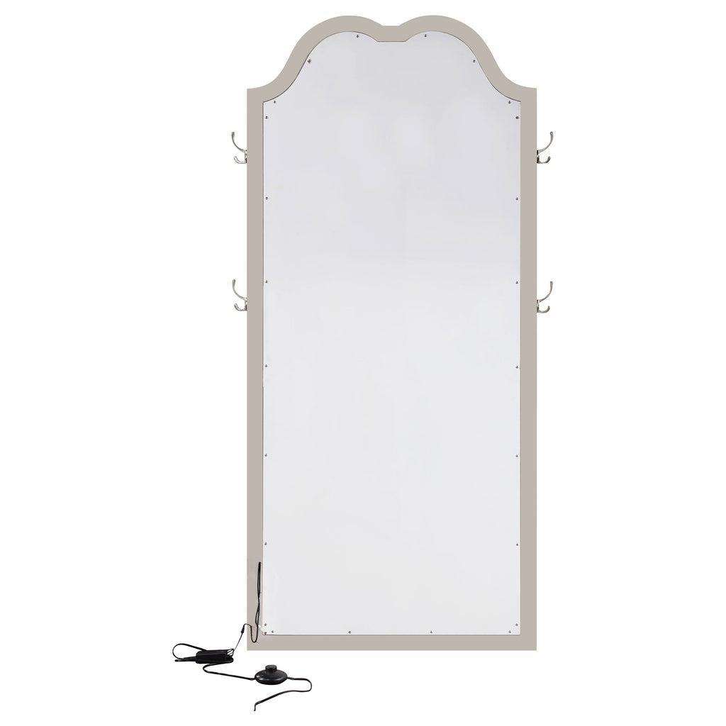 Chic couture style is a featured element of a lighted LED floor mirror well suited to fashionable living spaces. The Evangeline floor mirror offers a shapely silhouette with an arch top and rectangular profile. Its pine wood frame offers a silver oak finish, delightful and decadent. Side hangers add convenience, and LED lighting on its mirrored section is both mood-inducing and functional. A floor switch operates this glam-inspired mirror. Key Features: • Chic couture style floor mirror with arch top and rectangular profile • Pine wood frame with silver oak finish • Side hangers for convenience • LED lighting bordering frame for mood and function • Floor button on/of switch operation