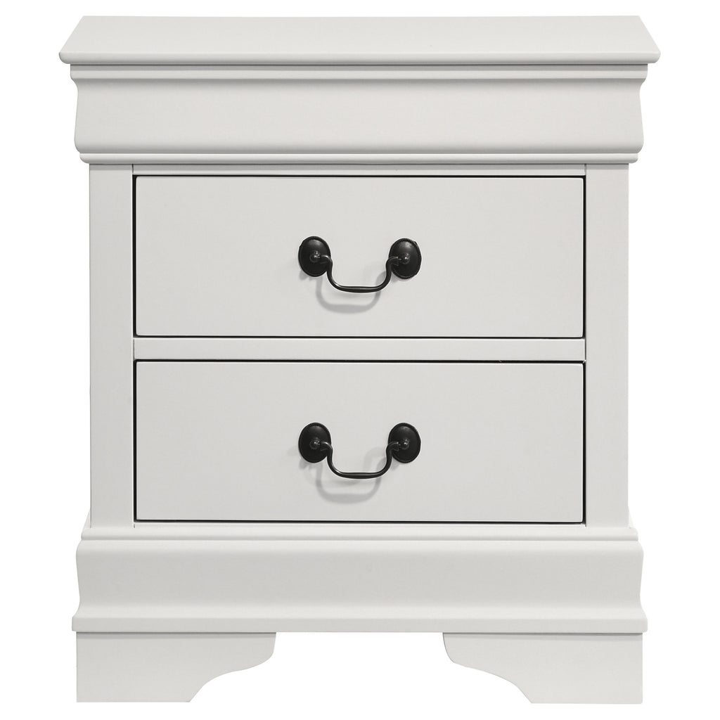 Add easy storage to your bedside with a stylish transitional two-drawer nightstand. In white, it's a versatile choice that complements a wide range of beds, linens, and surrounding decor. The nightstand offers a spacious top for a reading lamp and your phone, with drawers for overnights essentials. Each drawer is accented with a dark finish hanging pull and is built with a smooth metal glide for seamless performance. Molded trim and bracket feet complete the look, offering refined, understated style perfect for an approachable bedroom.