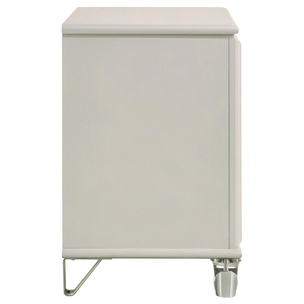 Elevate your nighttime routine with this stylish 2-drawer nightstand, a perfect blend of form and function. The pearl white finish and diamond star design on the drawer front offer a touch of glamour, while the chrome metal pulls add a sleek contrast. Featuring a top drawer with cord management access, this nightstand is designed to keep your devices neatly organized. The acrylic legs and chrome tulip-shaped caps provide a unique and elegant touch. Experience convenience and style right by your bedside. Key Features: • Contemporary 2-drawer nightstand in pearl white finish • Cord management access in top drawer • Acrylic legs with chrome tulip-shaped caps • Diamond star design with chrome metal pulls • Crafted with solid hardwood, and engineered wood