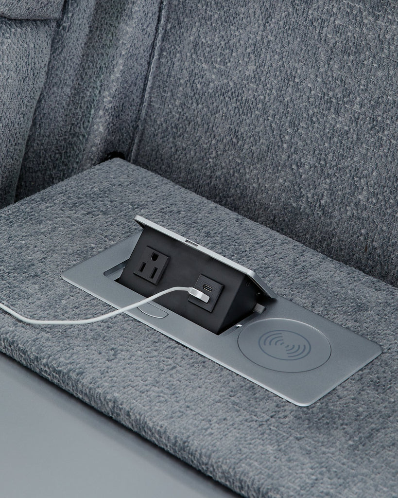 - Drop-down table with LED reading lights, dual cup holders, electrical outlet, USB charging (USB-A and USB-C) and wireless charging