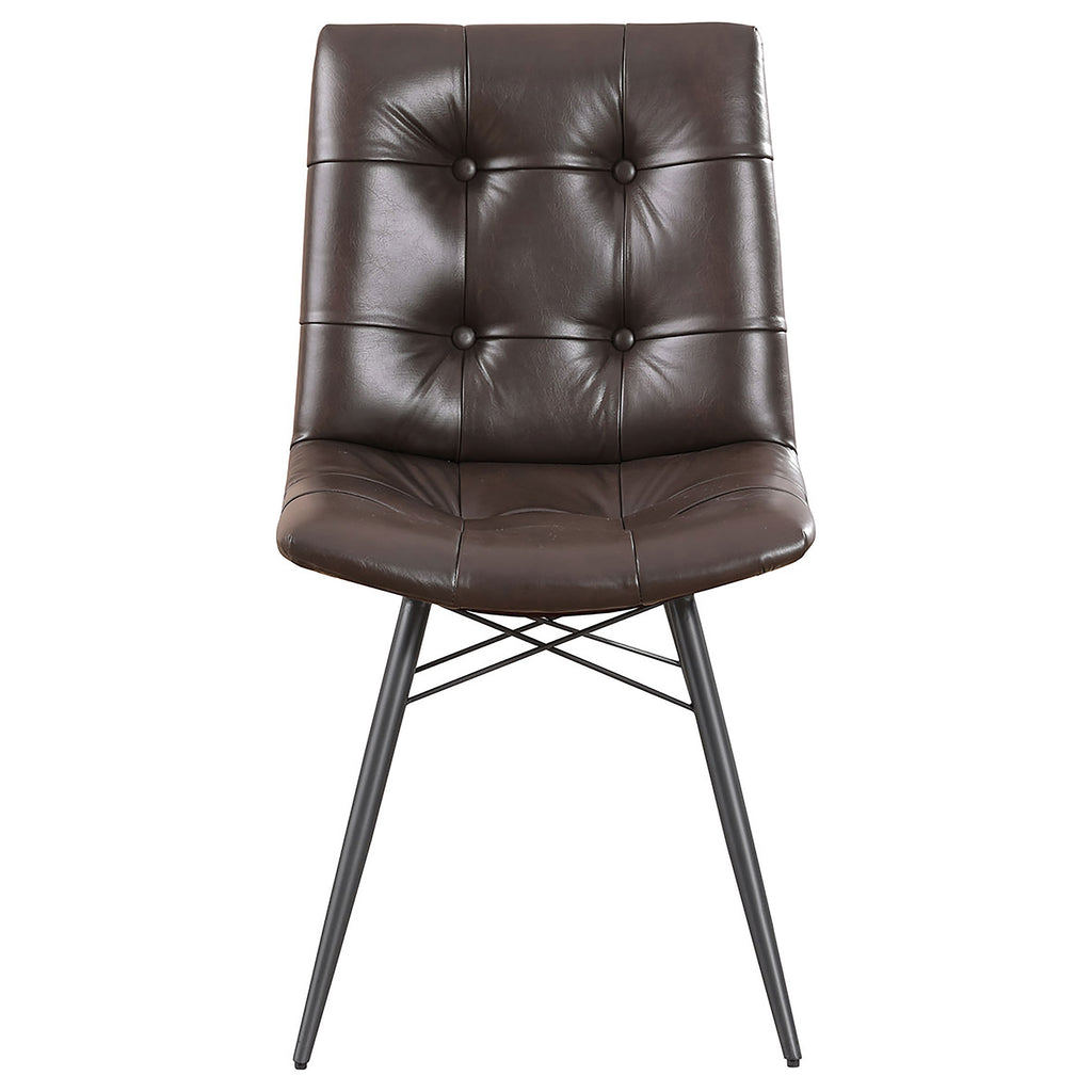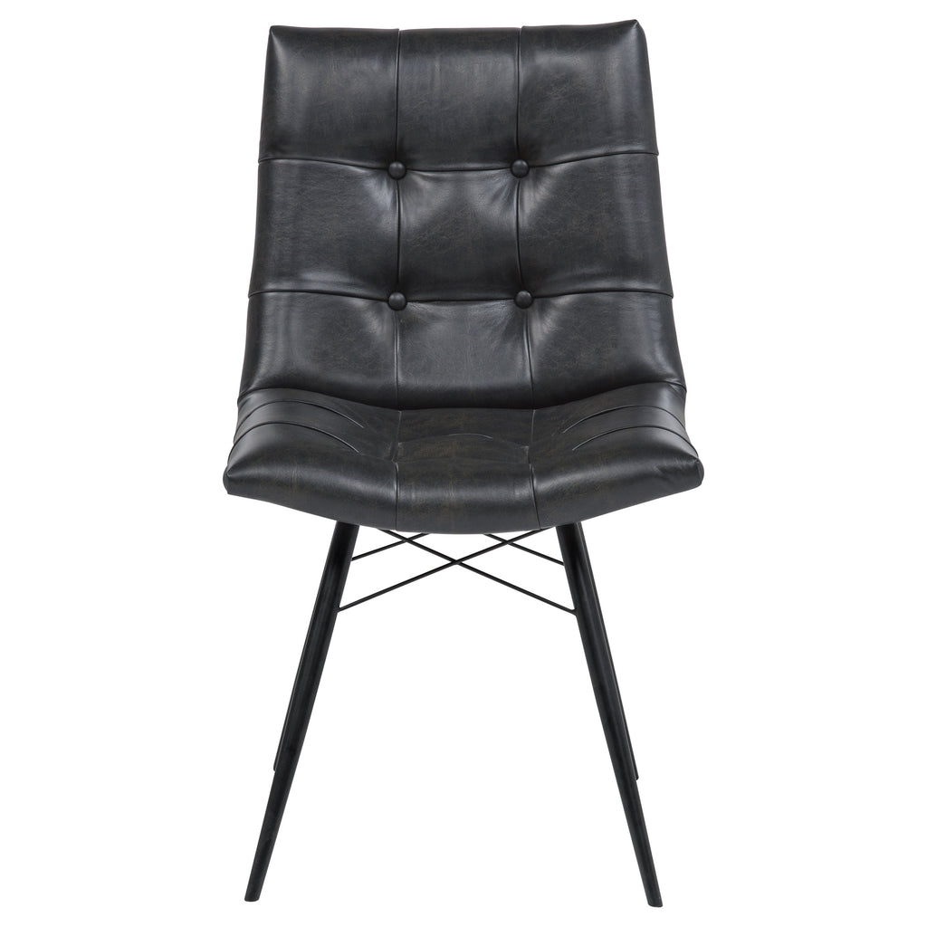 Blending mid-century modern aesthetics with everyday comfort, this dining side chair is a stylish addition to any dining space. Upholstered in charcoal faux leather, its gently curved tufted seat and backrest offer a supportive and inviting feel. Angled metal legs with crossing braces enhance stability while adding a striking visual element. The armless design provides a sleek, space-saving silhouette, making this chair ideal for both casual and formal dining settings. Key Features: • Mid-century modern dining chair with a sleek armless silhouette • Charcoal faux leather upholstery offers a refined and stylish touch • Gently curved backrest and seat provide ergonomic comfort and support • Button tufting adds depth and sophistication to the overall design • Angled metal legs with crossing braces enhance stability and durability • Versatile design complements contemporary, industrial, and modern spaces