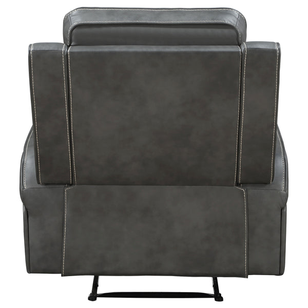Settle into comfort with this transitional recliner, blending modern lines with timeless appeal. Upholstered in smooth grey leatherette, it features vertical topstitching that adds depth and dimension. Plush foam padding and pocket coil seating provide supportive comfort, while an attached back cushion and ultra-padded headrest create the perfect spot for relaxation. A manual reclining mechanism offers multiple positions, and a wall-hugger design maximizes space efficiency, making this chair a smart choice for any living room._x005F_x000D_ Key Features: • Recliner upholstered in smooth grey leatherette with vertical topstitch accents • Manual reclining function provides adjustable comfort for relaxation at home • Wall-hugger design maximizes floor space in compact or larger living areas • Plush foam padding and pocket coil seating ensure durable supportive comfort • Attached back cushion with ultra-padded headrest enhances lounging experience • Durable plywood and metal frame construction offers stability and longevity