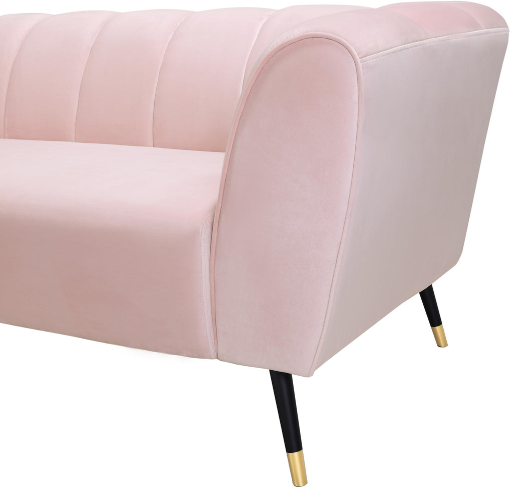 Sink your body into the inviting comfort of this Beaumont velvet sofa. Upholstered in a soft shade of pink with black metal legs tipped in gold, this chair oozes modern charm and up-to-the-minute comfort. The heavily stuffed arms, seat and back are bound to beckon at day���s end for you to sit and relax. Deep channel tufting on the back and arms adds to its uber welcoming look. Pair it with the matching pieces in the same collection for cohesive beauty.