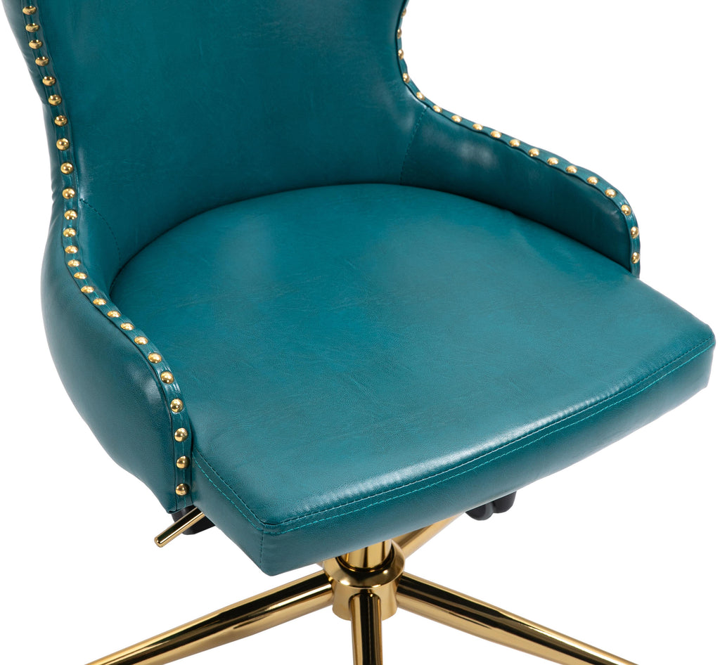 Sit back and take it easy in this Hendrix faux leather office chair. Its soft blue faux leather looks so real, no one but you will know it���s not. A rich gold base and coordinating nail head trim hardware adds a touch of elegance to this comfortable chair. Its swiveling function lets you easily turn at your workstation to perform different tasks, and the seat height is adjustable, so you can quickly find the best and most comfortable position.
