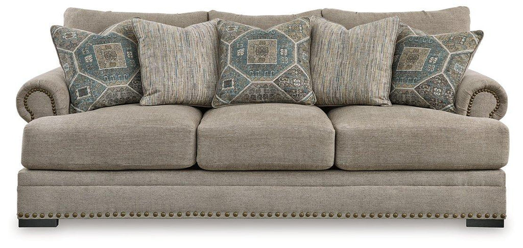 Looking to enhance your home's visual appeal? This sofa offers sophisticated design, comfort and elegance with tonal colors, roll arms and nailhead accents. Enjoy optimal coziness as you nestle into luxurious soft upholstery and feather-blend cushions. Perfect for modern spaces, it's just the spot to sit back and relax in style.