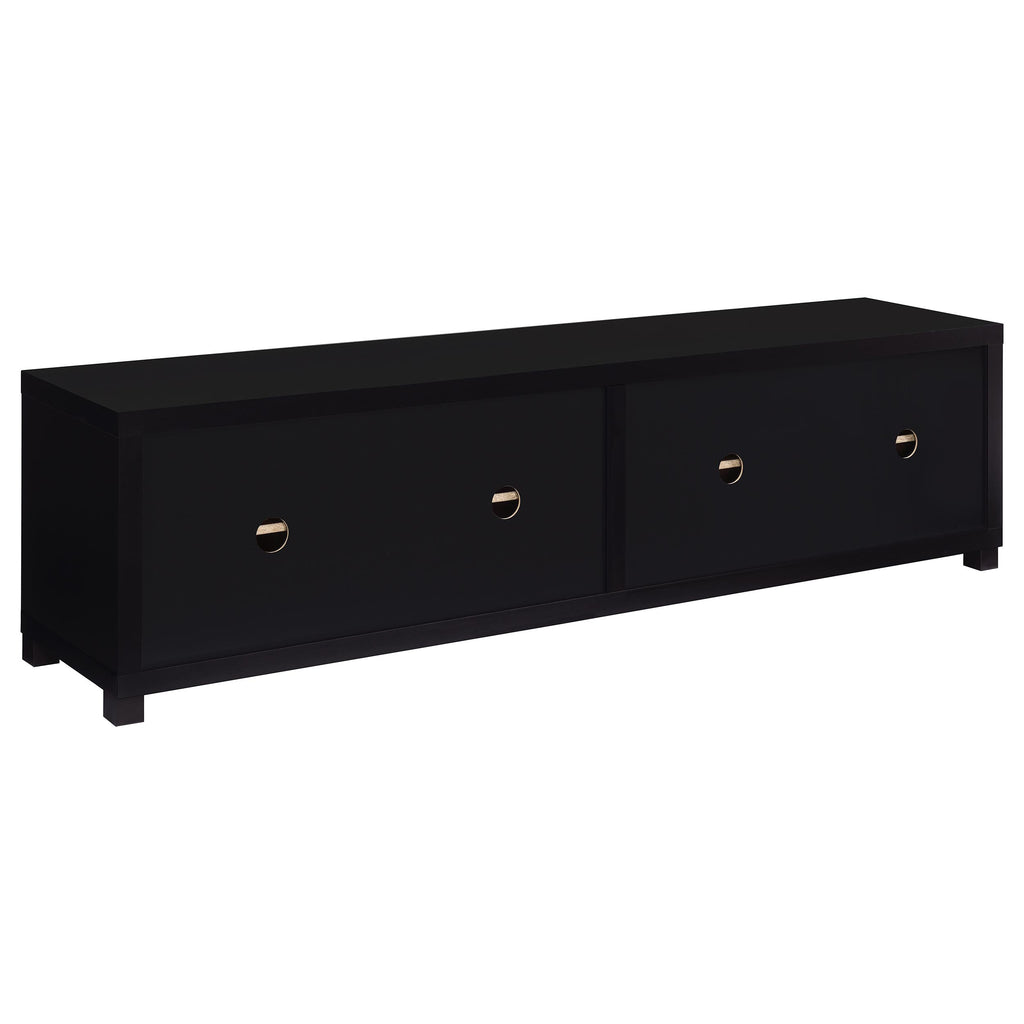 This 79-inch TV stand is the cornerstone of a home entertainment system, designed to anchor your viewing experience with both grandeur and functionality. Accommodating up to an 85-inch television, it brings cinema-scale enjoyment to the comfort of your living room. The quartet of doors opens to reveal adjustable shelves, offering tailored storage for all your media essentials. Crafted from engineered wood, this stand promises stability and longevity, allowing it to be a part of your home's stories for years to come. Its silhouette is as commanding as it is sleek, a testament to design that marries form with function.