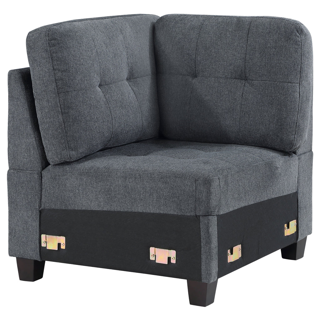 Complete your modular sectional with this corner chair, designed to maximize seating and style in your living space. Upholstered in a beautiful fabric, this chair seamlessly blends into transitional decor while offering exceptional comfort. The corner design is perfect for connecting other sectional pieces, creating a cohesive L-shaped configuration. Foam-padded cushions provide plush seating, supported by a durable wood frame that promises long-lasting use. The chair’s subtle tufting and chunky wood feet add a touch of elegance, making it a stylish addition to any room.