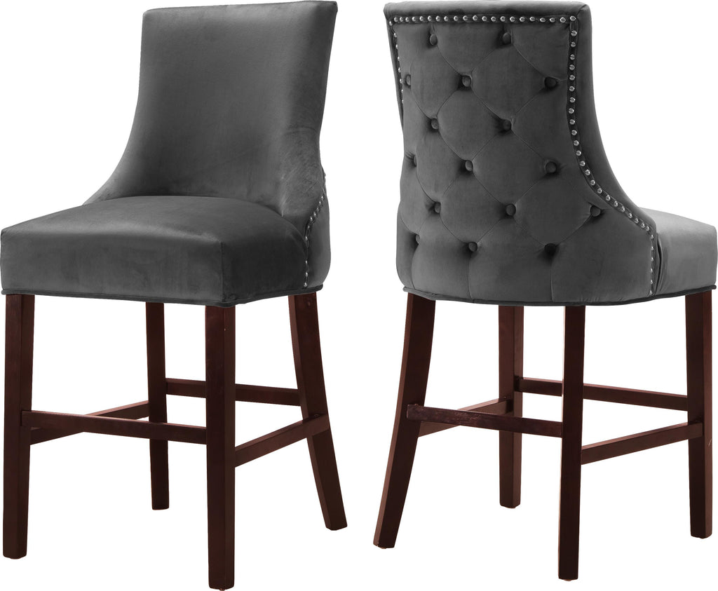 Add this Hannah Grey Velvet Stool to your home bar or kitchen counter to seat guests comfortably and in chic fashion. The grey velvet upholstery is thick and durable and has a slight sheen for a touch of glam. The back of the seat has deep button tufts for a posh look, while the front features smooth velvet upholstery for sleek comfort. The base is made from wood with an espresso finish and has a foot rail for extra support and comfort as you sit.