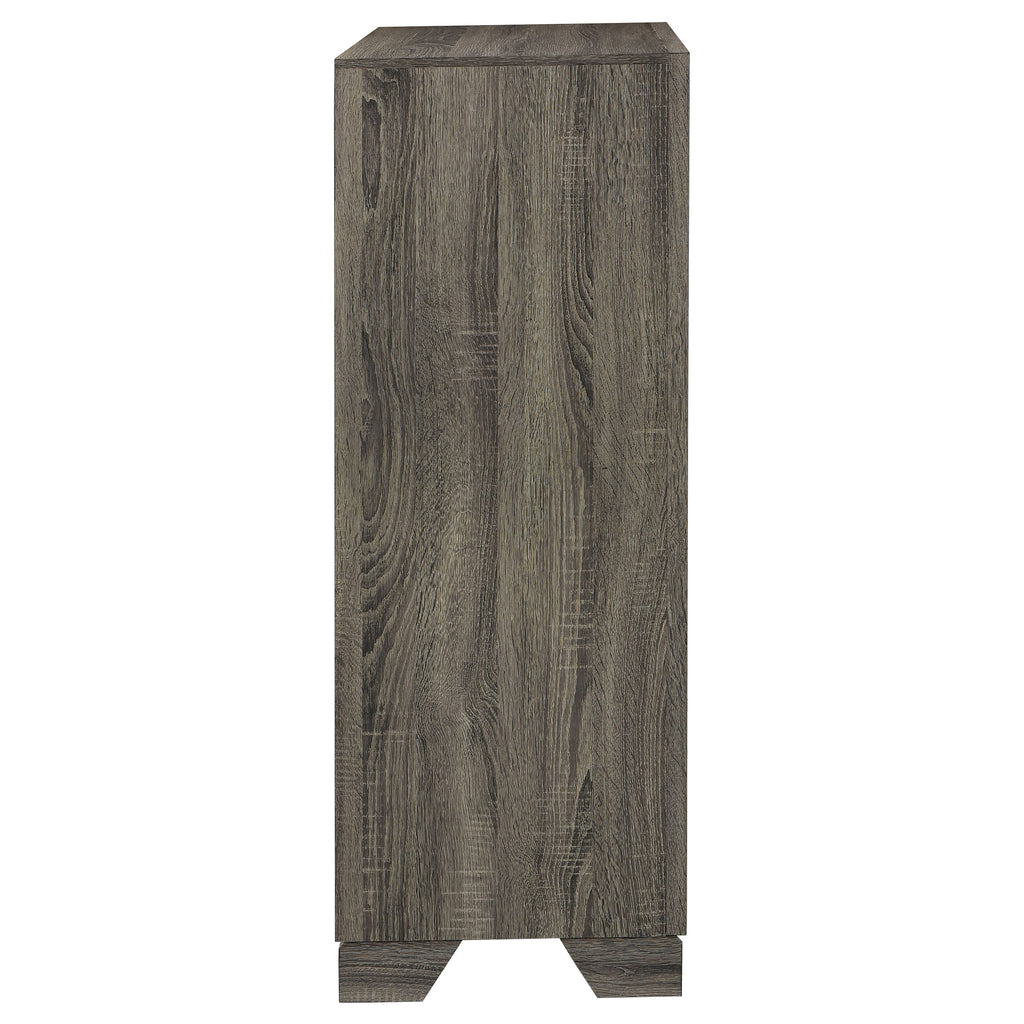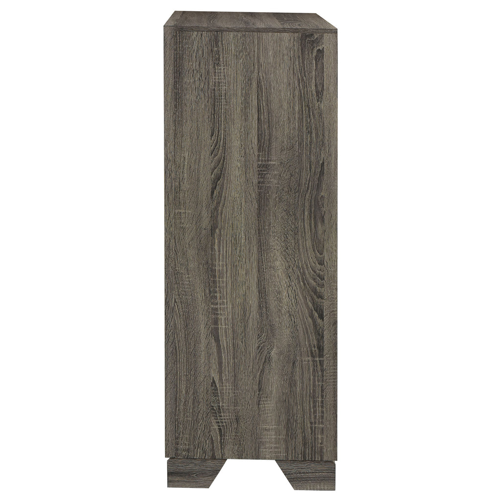 Upgrade your storage options for clothing and accessories with this transitional four-drawer chest. It delivers restrained, understated style with organic appeal, owing to its brown oak wood grain finish. Laminate surfaces add durability and resistance to scratches and dents from everyday wear and tear. Mitered trim surrounds the front of the case, while angular block legs add visual appeal and precision. Bar handles complete the look with a touch of smooth contrast.