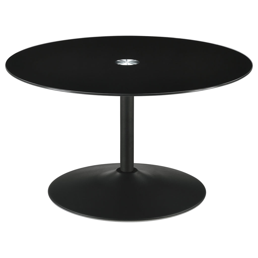 This modern coffee table showcases a sleek round design with a black tempered glass top, offering durability and style. The metal tulip base features a black powder-coated finish, creating a seamless and contemporary aesthetic. Perfect for living room settings, this cocktail table combines function and modern flair. Its sturdy construction ensures reliable support, while the minimalist design makes it a versatile centerpiece for any space.