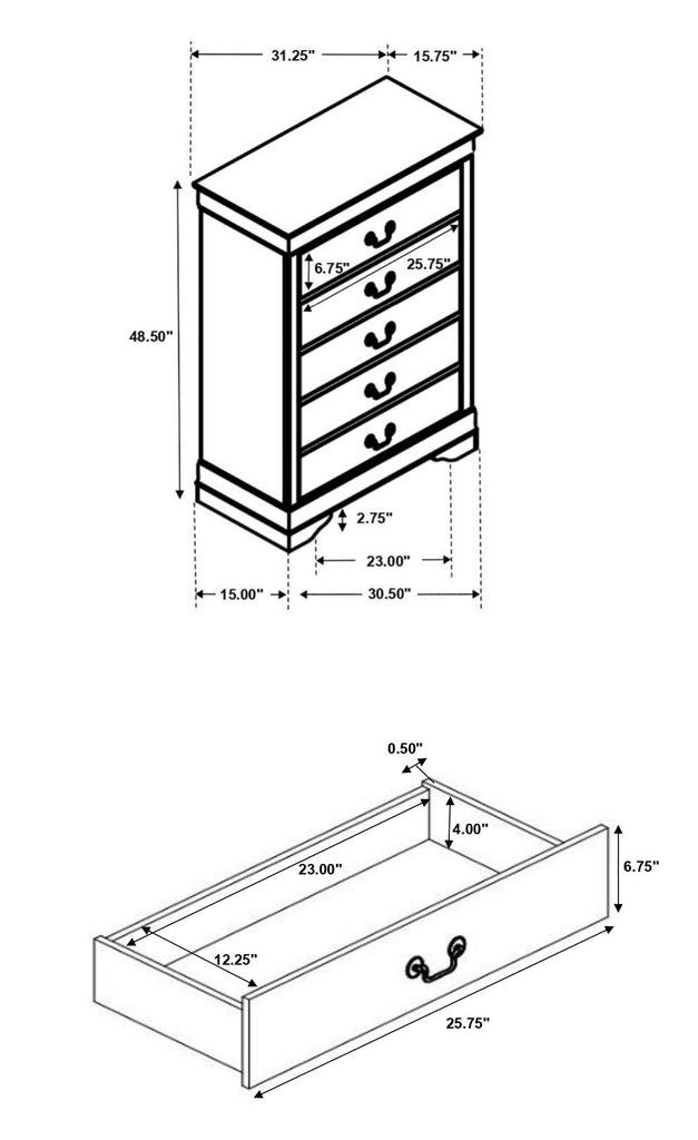 The Louis Philippe collection features this 5-piece bedroom set that is well-suited for a youth or guest bedroom. The Full bed (also available in Eastern King, Queen, and Twin) has a slightly flared headboard and footboard for added styling. The nightstand and chest have spacious drawers featuring dovetail construction and handy yet stylish silver bail handles. The dresser features drawers with similar construction and accents as well as enough space on top for the rectangular mirror with clean lines to complete the look. This traditional style set is crafted from select hardwoods and wood veneer and with a warm cappuccino finish for an elegant appeal.